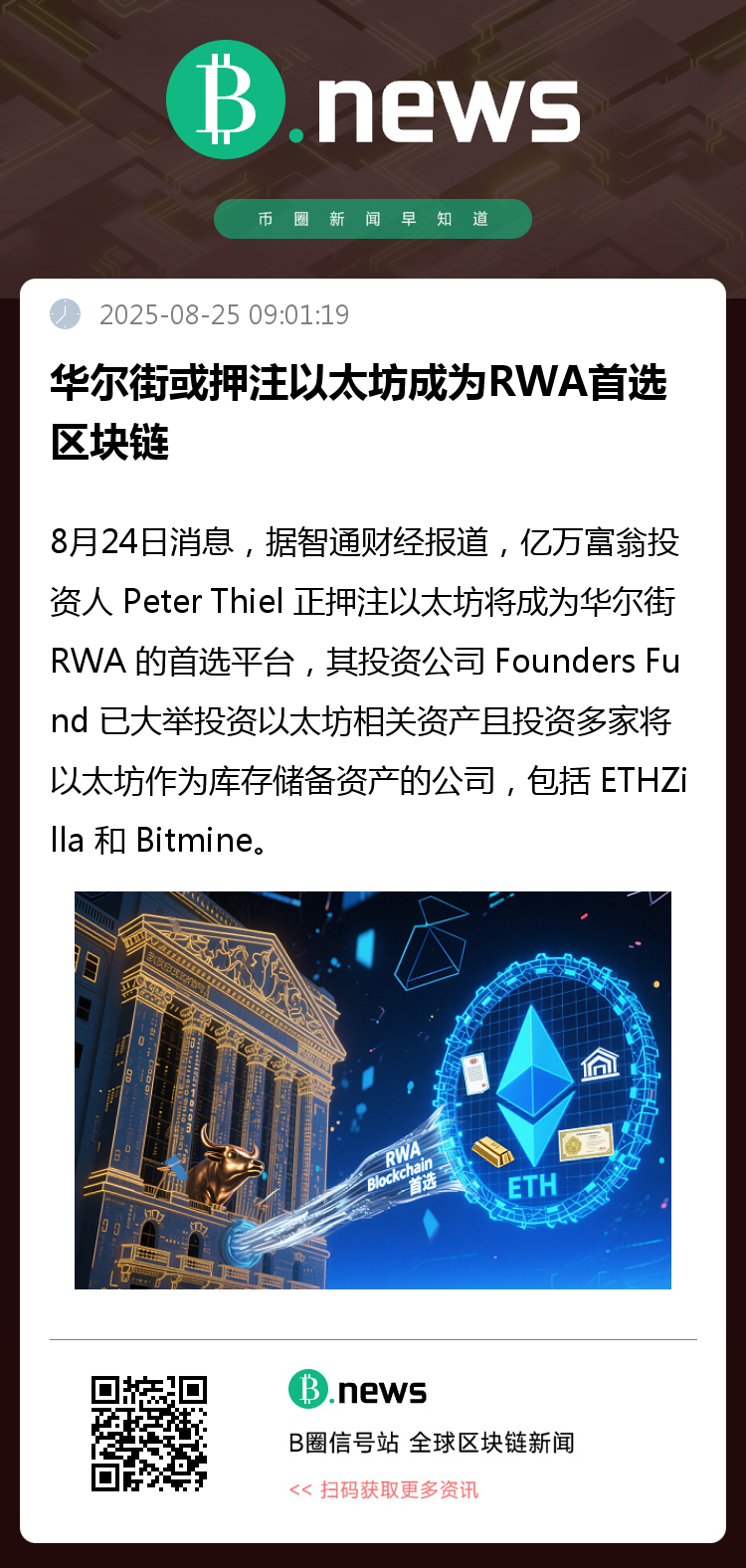 8月24日,据智通财经报道,知名亿万富翁投资人、PayPal联合创始人 Peter Thiel 正在积极布局以太坊生态,押注其将成为华尔街进行真实世界资产(RWA)代币化的首选平台。Thiel 所创立的 Founders Fund 已大规模购入与以太坊相关的资产,并投资了多家选择将以太坊作为库存储备资产的创新企业,其中包括 ETHZilla 与 Bitmine 等。