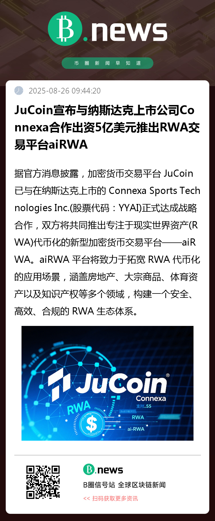 据官方消息披露,加密货币交易平台 JuCoin 已与在纳斯达克上市的 Connexa Sports Technologies Inc.(股票代码:YYAI)正式达成战略合作,双方将共同推出专注于现实世界资产(RWA)代币化的新型加密货币交易平台——aiRWA。
