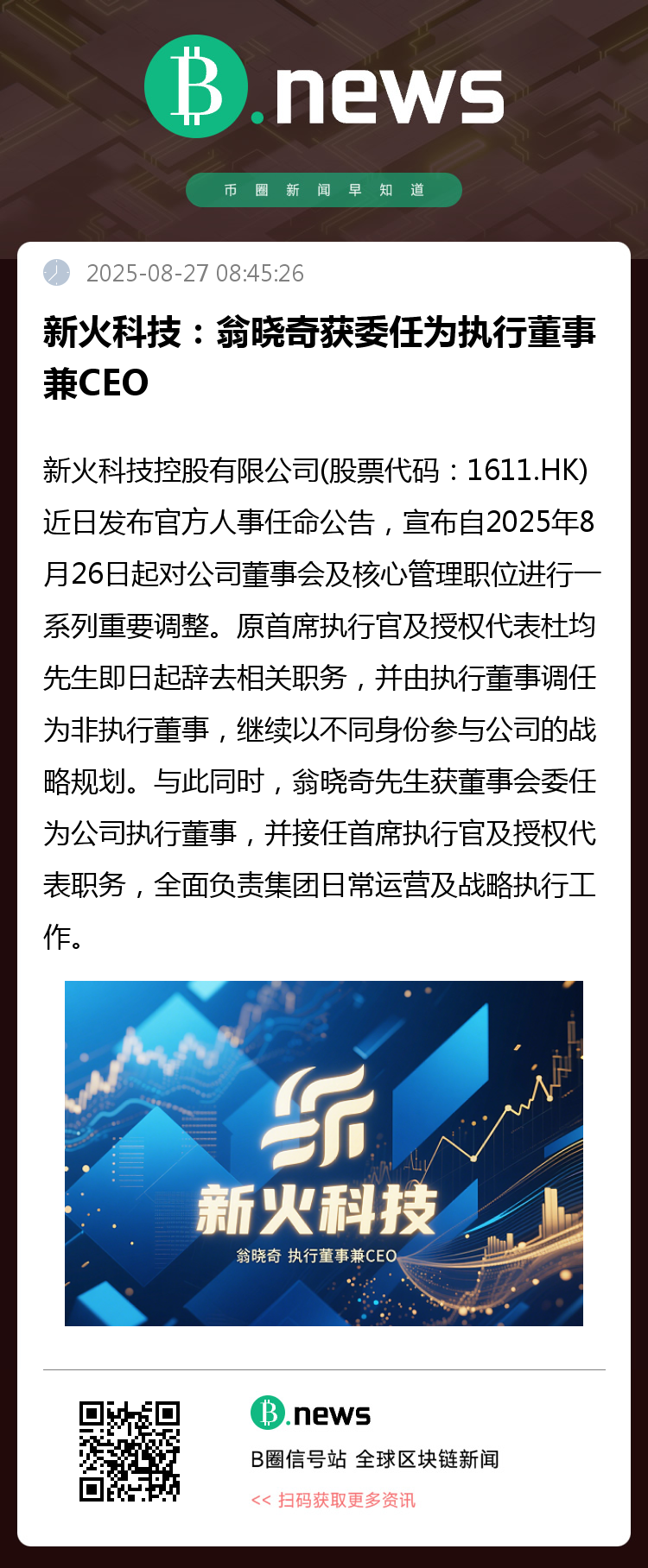 新火科技控股有限公司(股票代码:1611.HK)近日发布官方人事任命公告,宣布自2025年8月26日起对公司董事会及核心管理职位进行一系列重要调整。