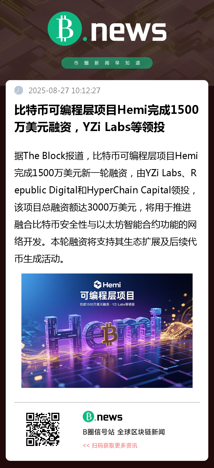 据The Block报道,比特币可编程层项目Hemi完成1500万美元新一轮融资,由YZi Labs、Republic Digital和HyperChain Capital领投,Breyer Capital、Big Brain Holdings、Crypto.com、DNA Fund、Selini Capital、Protein Capital、Quantstamp和Web3.com Ventures等机构参投。该项目总融资额达3000万美元,将用于推进融合比特币安全性与以太坊智能合约功能的网络开发。本轮融资将支持其生态扩展及后续代币生成活动。