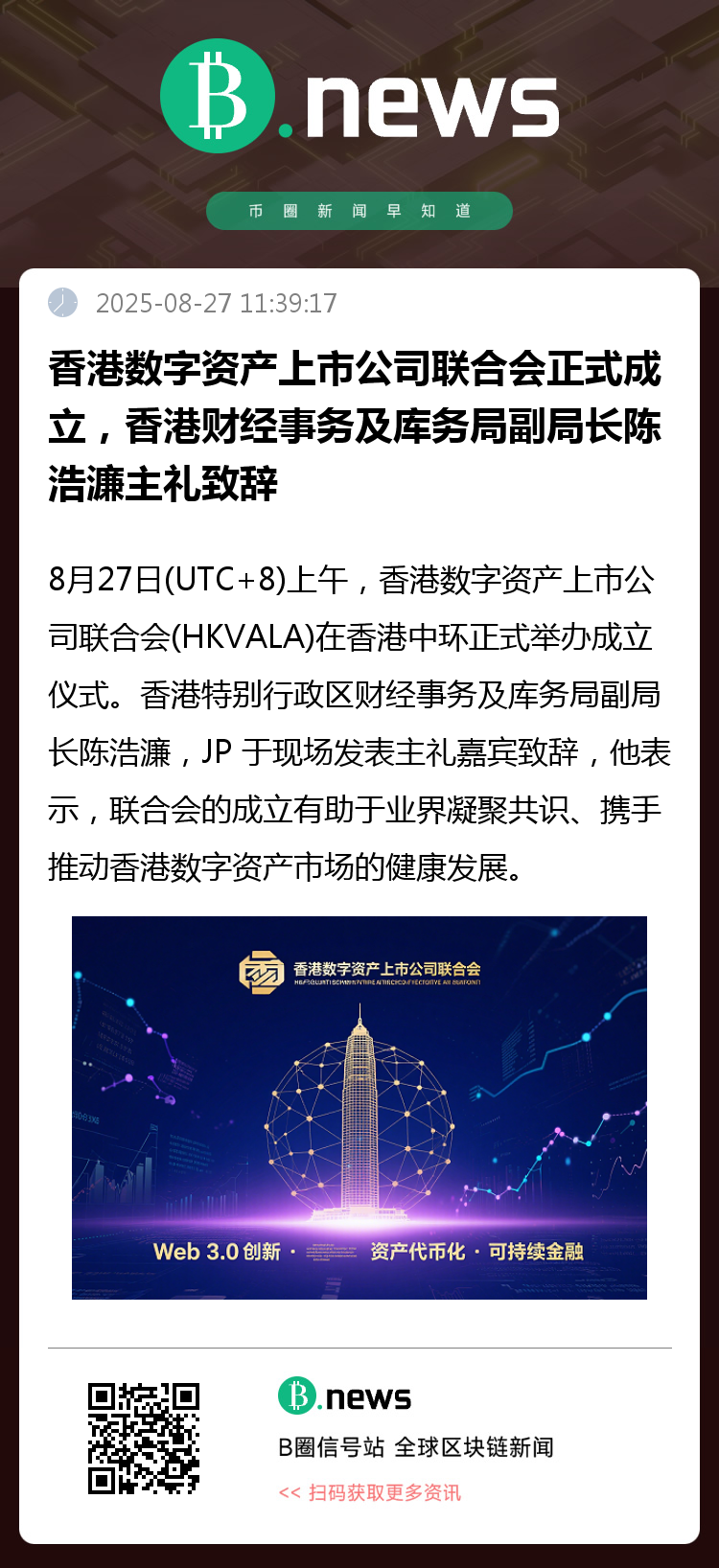 8 月 27 日(UTC+8),香港数字资产上市公司联合会(HKVALA)在香港中环举办成立仪式。香港特别行政区财经事务及库务局副局长陈浩濂,JP于现场发表主礼嘉宾致辞,他表示,联合会的成立有助于业界凝聚共识、携手推动香港数字资产市场的健康发展。
