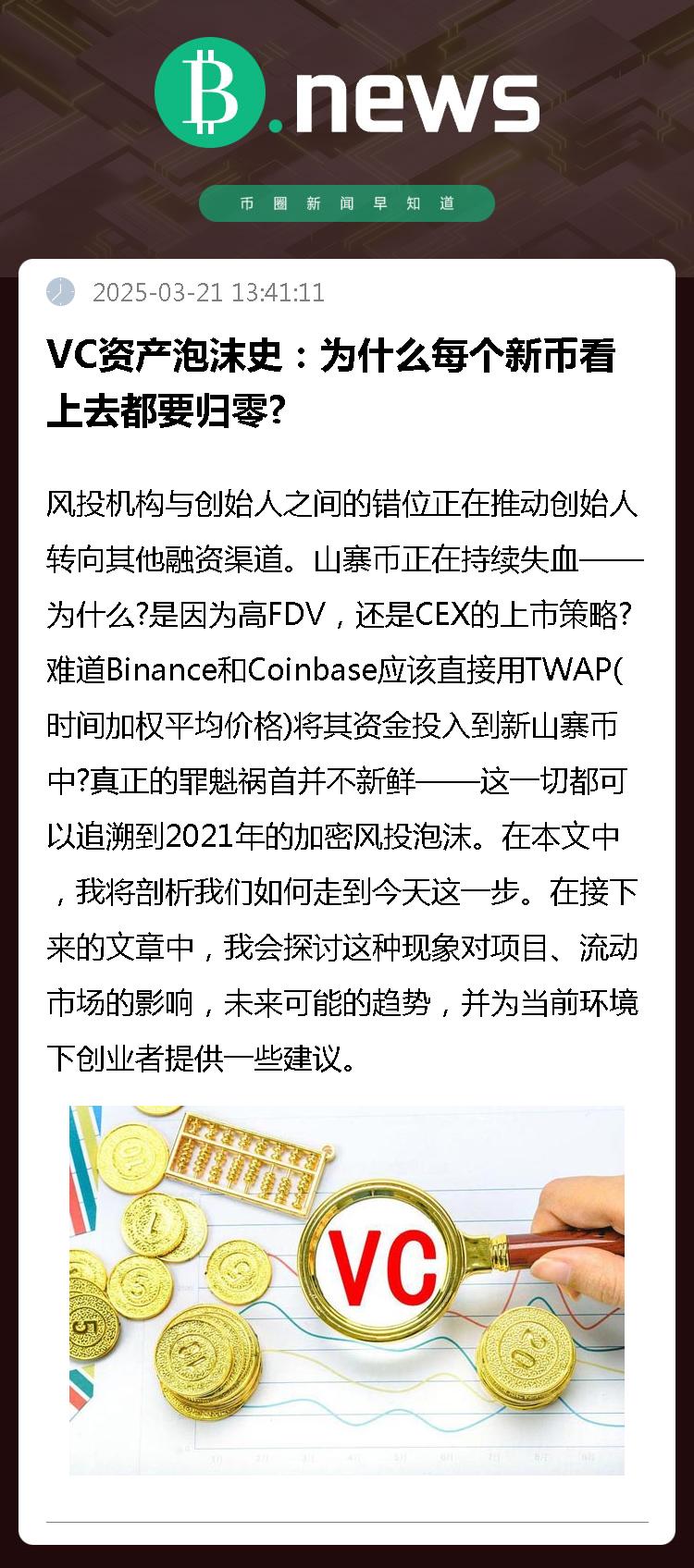 山寨币正在持续失血——为什么?是因为高FDV,还是CEX的上市策略?难道Binance和Coinbase应该直接用TWAP(时间加权平均价格)将其资金投入到新山寨币中?真正的罪魁祸首并不新鲜——这一切都可以追溯到2021年的加密风投泡沫。