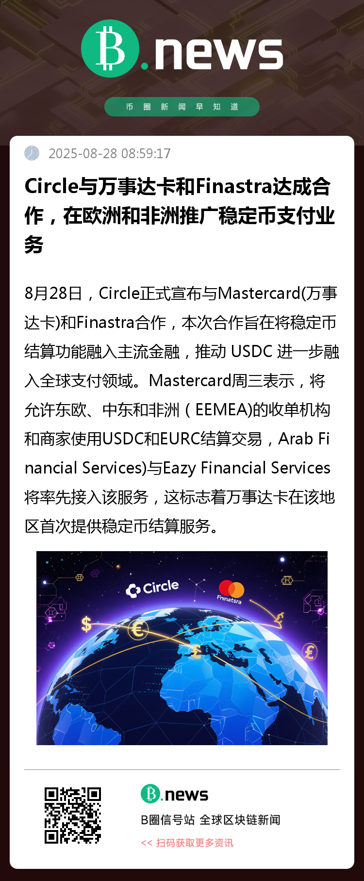 8月28日,Circle宣布与Mastercard(万事达卡)和Finastra合作,本次合作旨在将稳定币结算功能融入主流金融,推动 USDC 进一步融入全球支付领域。