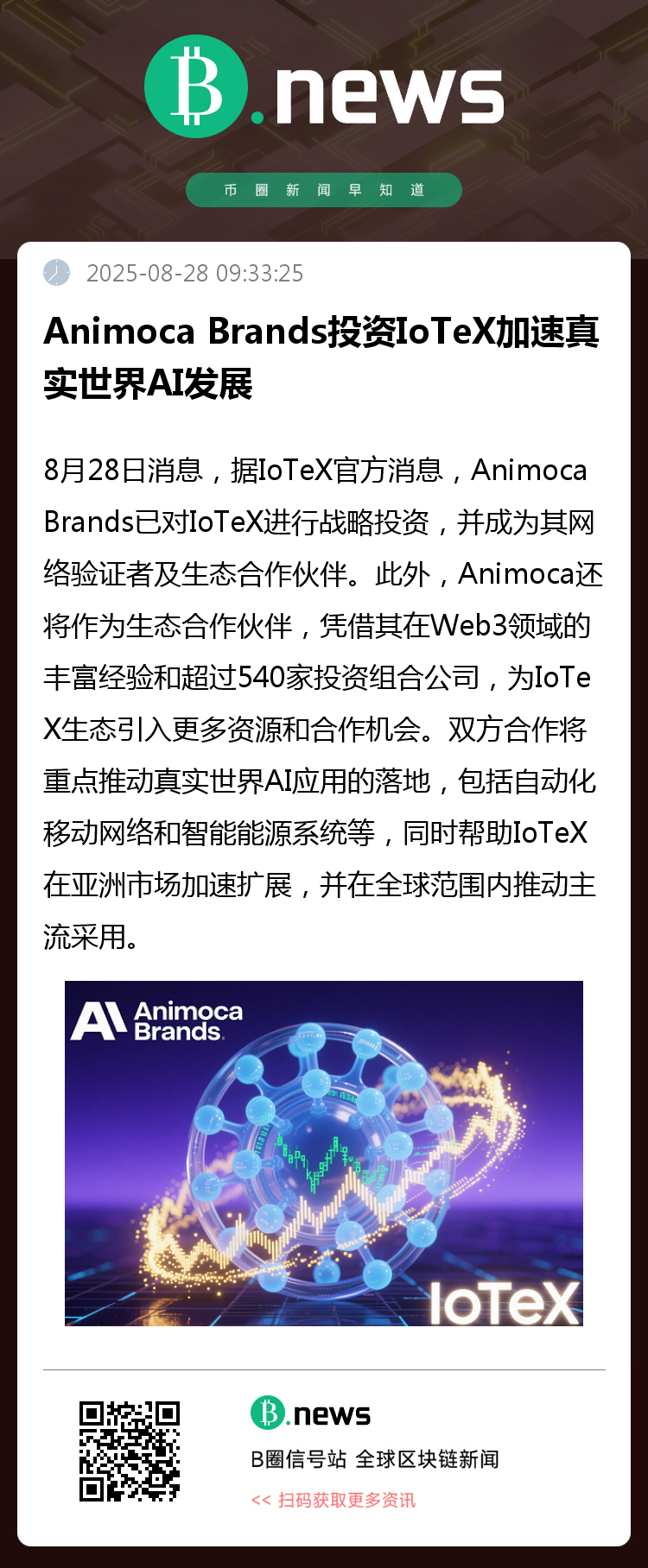 8月28日,区块链平台IoTeX宣布获得Animoca Brands的战略投资,双方正式建立生态合作伙伴关系。Animoca Brands不仅是IoTeX网络的重要验证节点,也将凭借其在Web3领域深厚的行业资源与全球影响力,为IoTeX生态注入新动力。