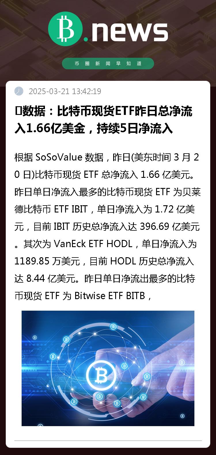 根据 SoSoValue 数据,昨日(美东时间 3 月 20 日)比特币现货 ETF 总净流入 1.66 亿美元。