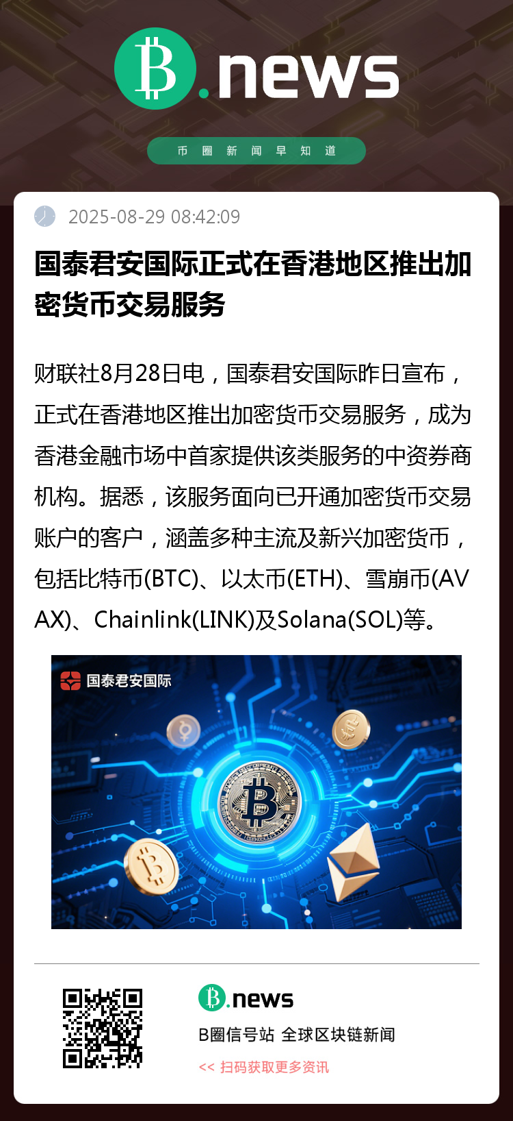 财联社8月28日电,国泰君安国际昨日宣布,正式在香港地区推出加密货币交易服务,成为香港金融市场中首家提供该类服务的中资券商机构。据悉,该服务面向已开通加密货币交易账户的客户,涵盖多种主流及新兴加密货币,包括比特币(BTC)、以太币(ETH)、雪崩币(AVAX)、Chainlink(LINK)及Solana(SOL)等。此外,具备专业投资者资格的客户还可接入更多元化的进阶投资标的,例如瑞波币(XRP)、泰达币(USDT)以及美元稳定币(USDC)等产品。