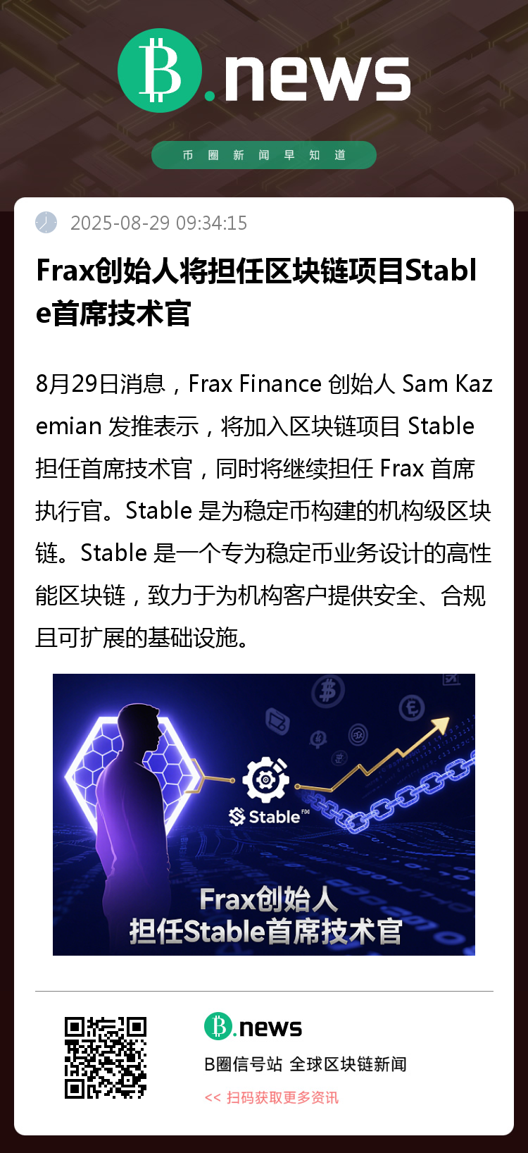 Stable 是一个专为稳定币业务设计的高性能区块链,致力于为机构客户提供安全、合规且可扩展的基础设施。Sam Kazemian 此次的加入,被视为其个人在稳定币与区块链底层技术整合方面的重要战略布局,也意味着Frax Finance与Stable未来可能在稳定币发行、跨链机制及机构服务等领域展开更深层次的协作。