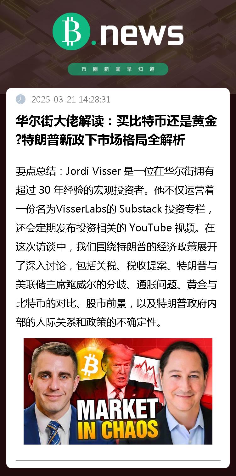 要点总结:Jordi Visser 是一位在华尔街拥有超过 30 年经验的宏观投资者。他不仅运营着一份名为VisserLabs的 Substack 投资专栏,还会定期发布投资相关的 YouTube 视频。在这次访谈中,我们围绕特朗普的经济政策展开了深入讨论,包括关税、税收提案、特朗普与美联储主席鲍威尔的分歧、通胀问题、黄金与比特币的对比、股市前景,以及特朗普政府内部的人际关系和政策的不确定性。