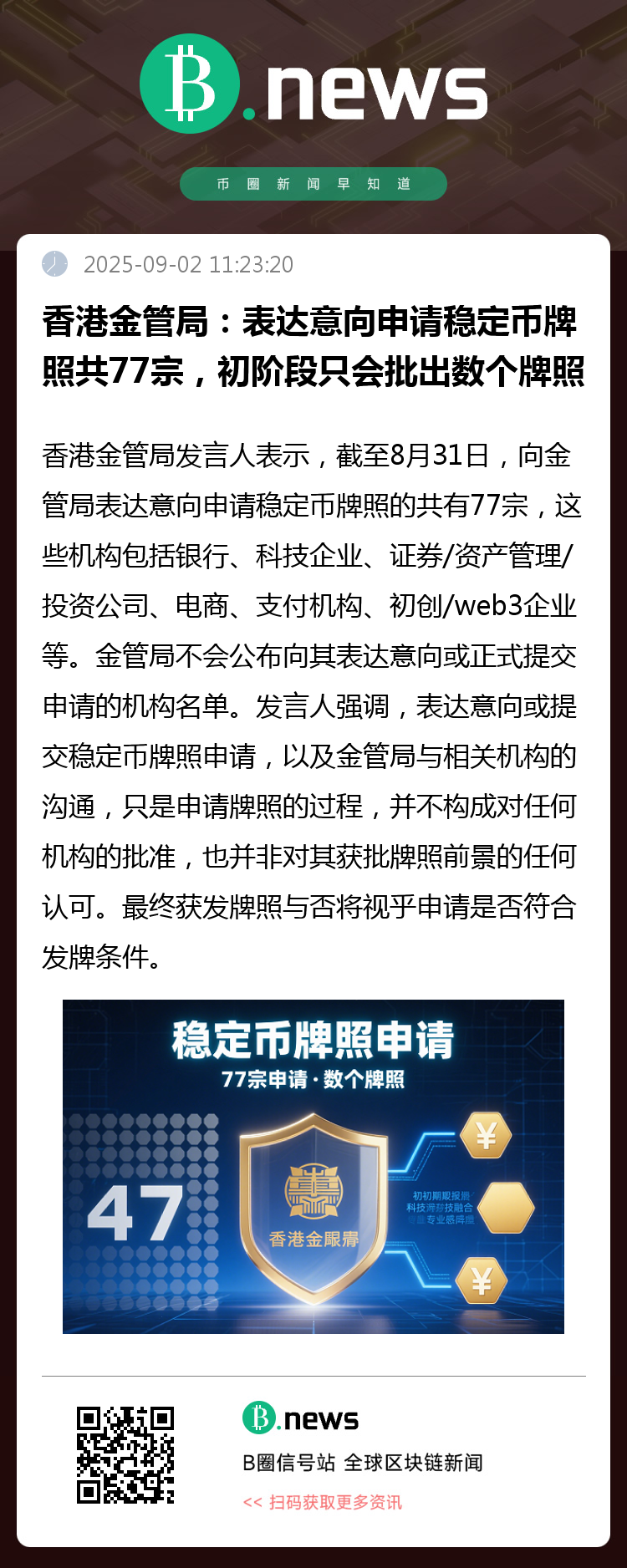 香港金融管理局(金管局)发言人近日透露,截至今年8月31日,该局共收到77家机构就稳定币发行人牌照提交的意向申请。