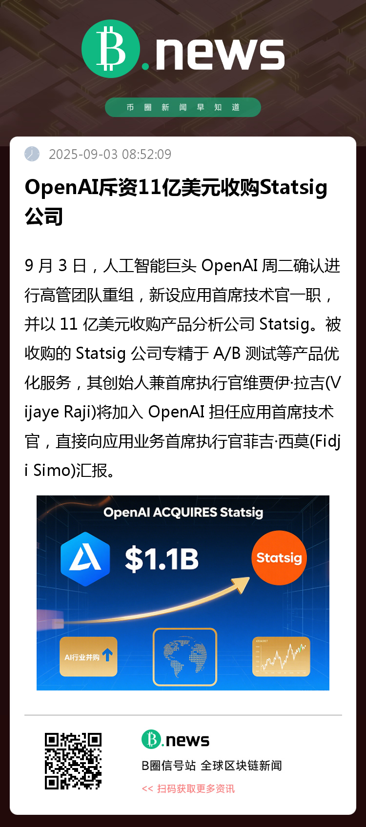 9月3日,全球人工智能领域的领军企业 OpenAI 正式宣布了一项重要的高管团队重组计划。该公司新设立了应用首席技术官(CTO of Applications)一职,并同时确认以11亿美元收购专业产品分析公司 Statsig,进一步强化其在产品优化与数据驱动决策方面的能力。