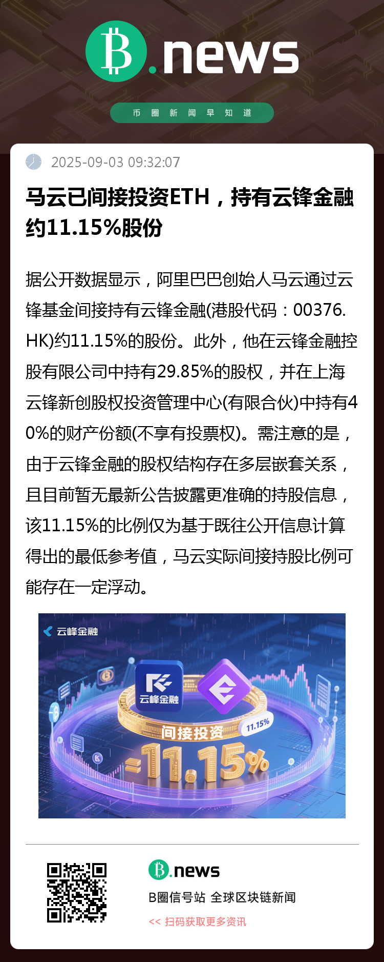 因云锋金融的持股结构较为复杂,且未有披露更进一步的穿透股权信息,上述马云持股比例仅供参考,实际权益比例请以公司最新官方公告为准。