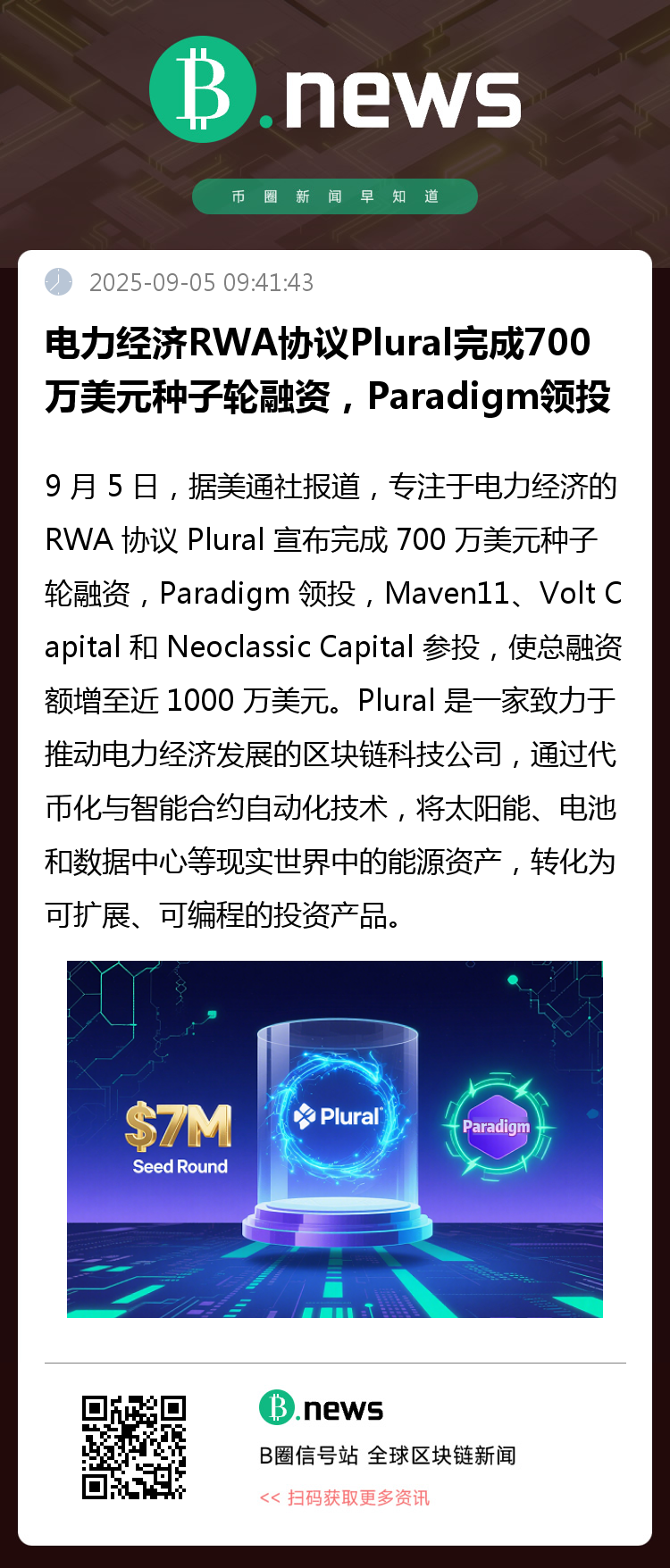 9月5日,据美通社消息,专注于电力经济领域的现实世界资产(RWA)协议 Plural 宣布完成700万美元种子轮融资。本轮融资由知名加密投资机构 Paradigm 领投,Maven11、Volt Capital 和 Neoclassic Capital 等多家机构参与跟投。至此,Plural 累计融资总额已接近1000万美元。