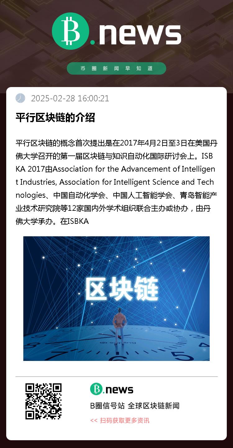 平行区块链的概念首次提出是在2017年4月2日至3日在美国丹佛大学召开的第一届区块链与知识自动化国际研讨会上。ISBKA 2017由Association for the Advancement of Intelligent Industries, Association for Intelligent Science and Technologies、中国自动化学会、中国人工智能学会、青岛智能产业技术研究院等12家国内外学术组织联合主办或协办,由丹佛大学承办。在ISBKA 2017上,来自中国、美国、加拿大、澳大利亚等国家和地区的50余位专家共同探讨区块链与知识自动化领域的热点问题和技术进展,中国科学院自动化研究所王飞跃教授作了”Parallel Blockchain:Concept, Techniques and Applications”主旨报告,首次提出并解读了平行区块链的概念、技术及其在金融、交通、健康和农业等领域的初步应用实践。2017年10月,中国科学院自动化研究所袁勇副研究员和王飞跃教授发表了平行区块链领域国内第一篇学术论文“平行区块链: 概念、方法与内涵解析”。