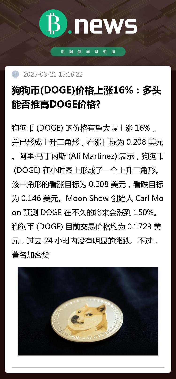 马丁内斯表示,如果最终收盘价超出这一范围,可能引发价格上涨 16%,这表明 DOGE 可能出现突破。