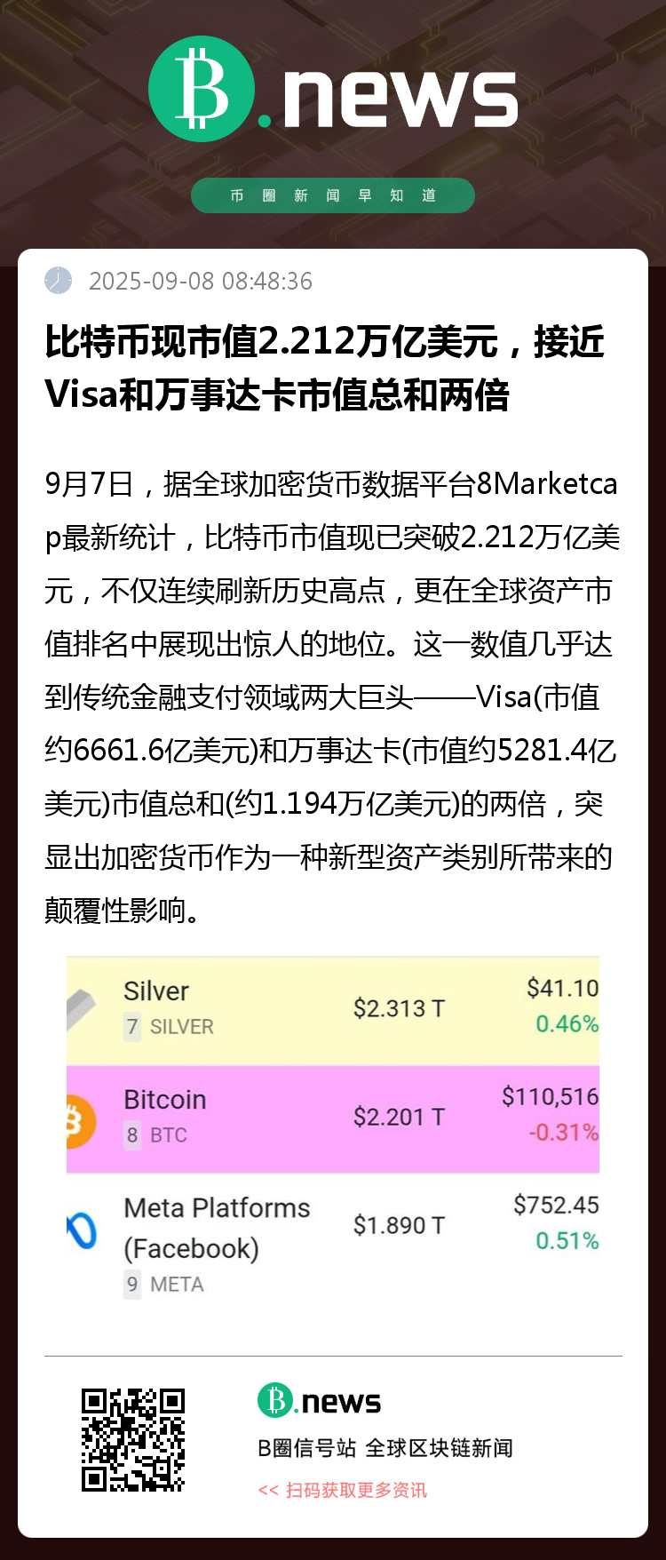 据全球加密货币数据平台8Marketcap最新统计,比特币市值已突破2.212万亿美元,不仅连续刷新历史高点,更在全球资产市值排名中展现出惊人的地位。这一数值几乎达到传统金融支付领域两大巨头——Visa(市值约6661.6亿美元)和万事达卡(市值约5281.4亿美元)市值总和(约1.194万亿美元)的两倍,突显出加密货币作为一种新型资产类别所带来的颠覆性影响。