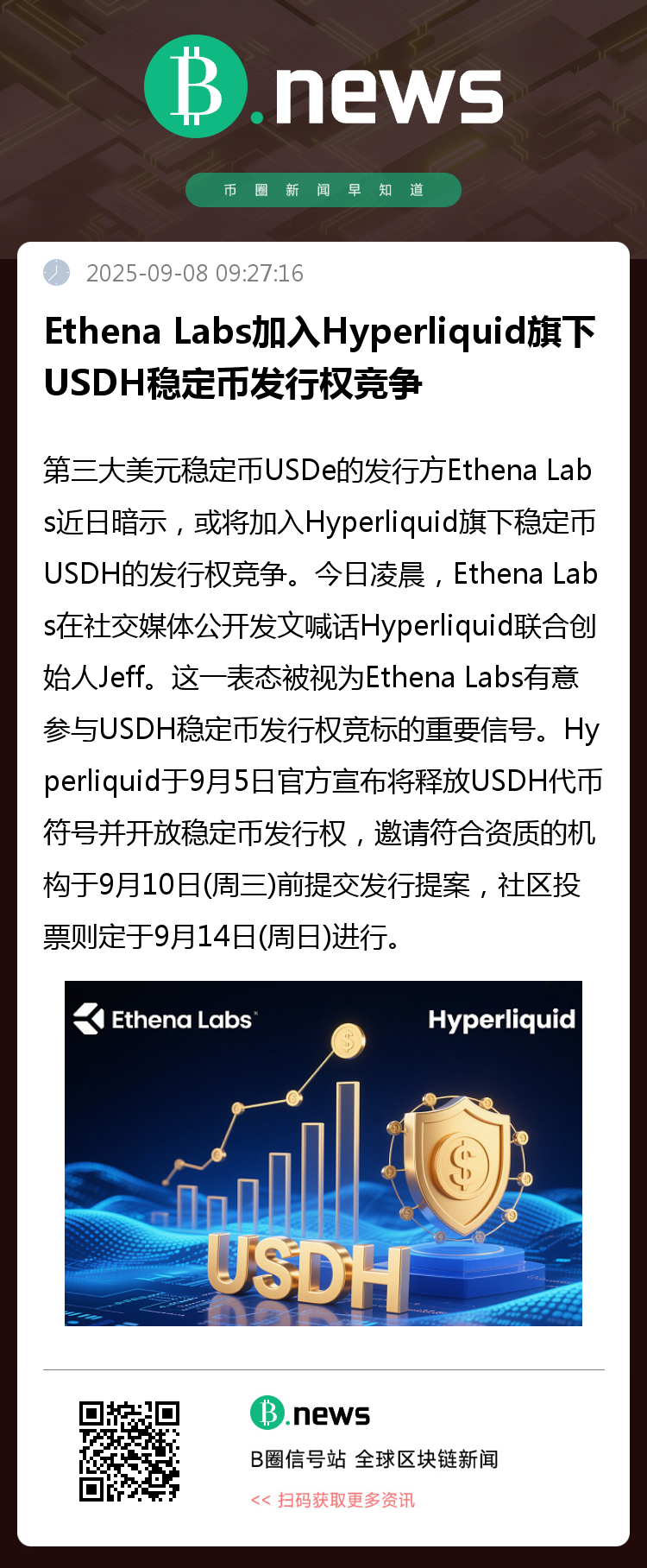 这一表态被视为Ethena Labs有意参与USDH稳定币发行权竞标的重要信号。此前于9月5日,Hyperliquid官方宣布将释放USDH代币符号并开放稳定币发行权,邀请符合资质的机构于9月10日(周三)前提交发行提案,社区投票则定于9月14日(周日)进行。