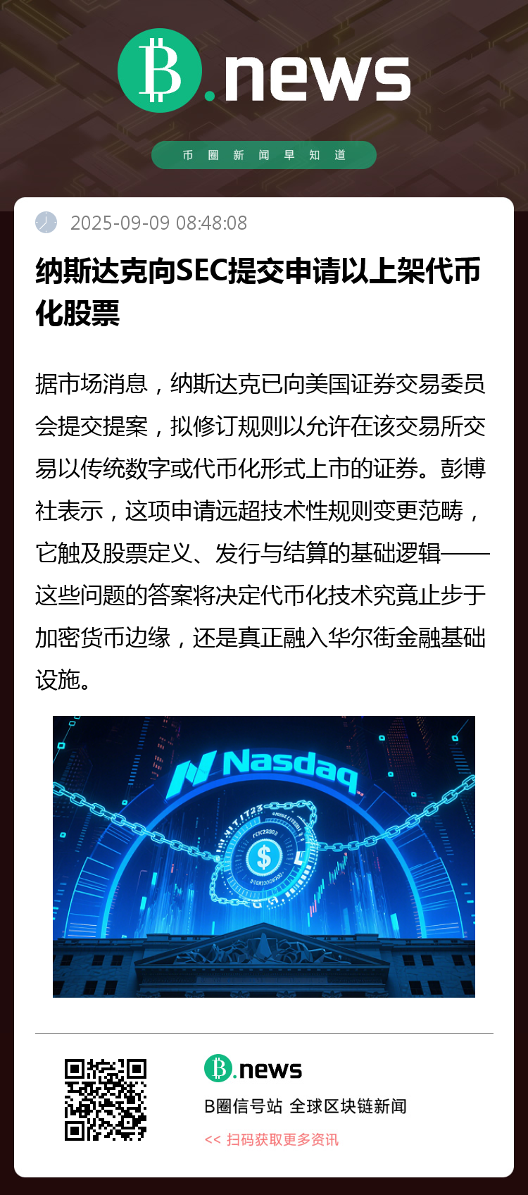 据市场消息透露,纳斯达克已正式向美国证券交易委员会(SEC)提交了一份规则修订提案,旨在允许该交易所上市并以传统数字形式或代币化形式交易证券。此举被视为纳斯达克在拥抱资产代币化趋势、整合区块链技术方面迈出的重要一步。