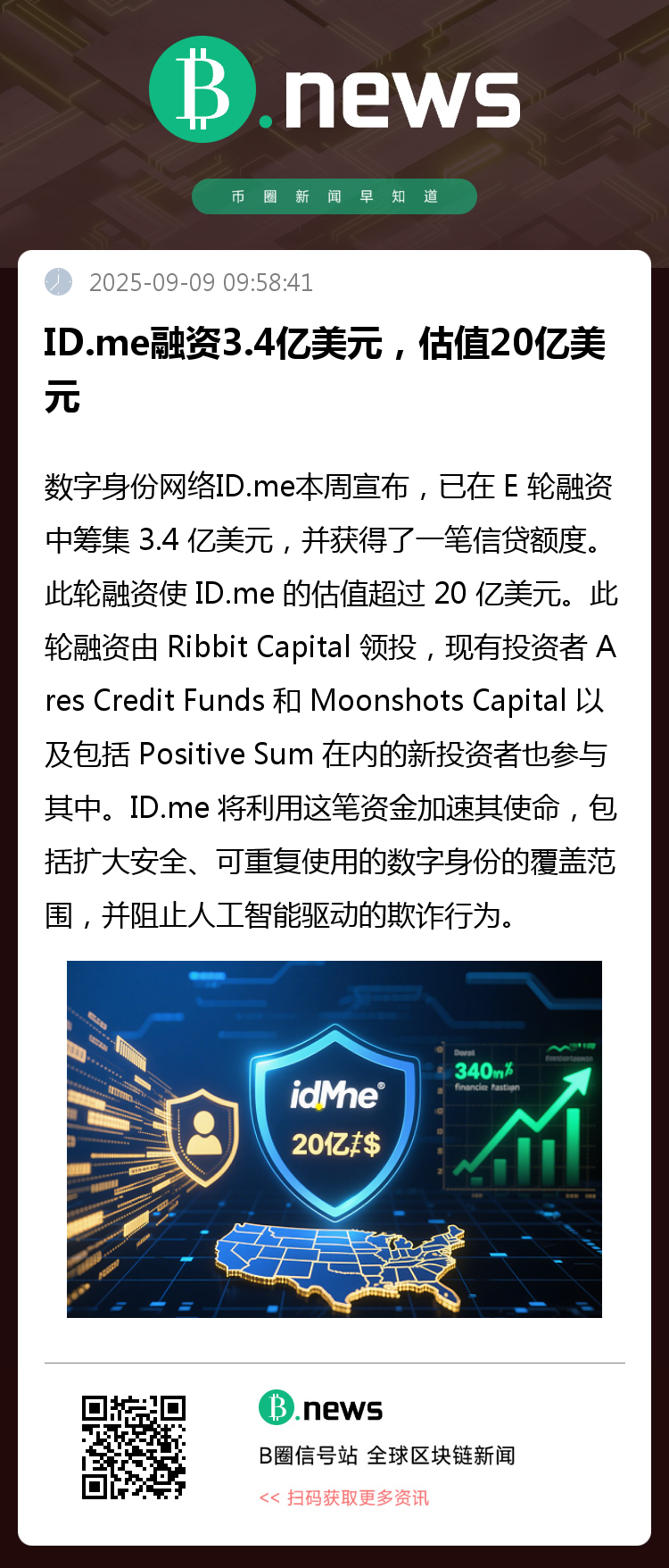 数字身份网络ID.me本周正式宣布,已在E轮融资中成功筹集3.4亿美元,并额外获得一笔信贷额度。本轮融资由RibbitCapital领投,现有投资者Ares Credit Funds和Moonshots Capital,以及新进投资机构Positive Sum等共同参与。融资完成后,ID.me的估值已突破20亿美元,标志着市场对其商业模式和技术路径的高度认可。