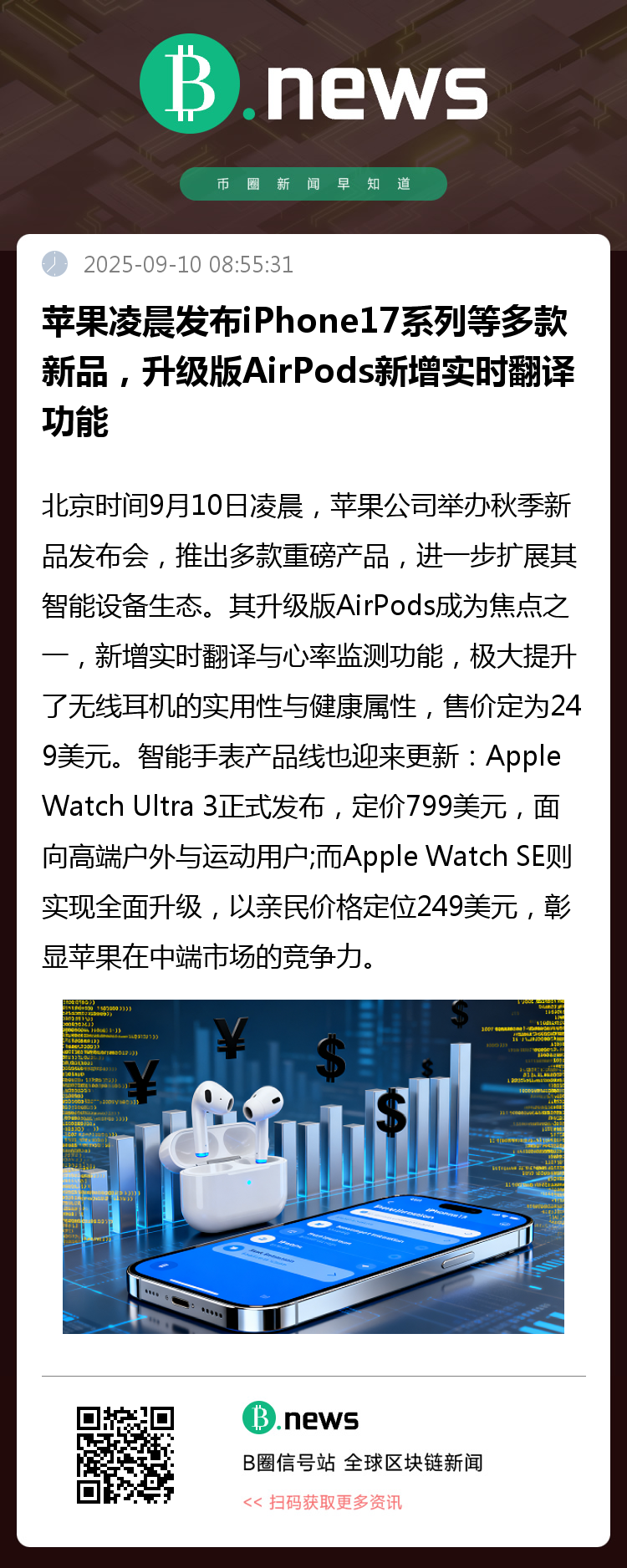 北京时间9月10日凌晨,苹果公司举办秋季新品发布会,推出多款重磅产品,进一步扩展其智能设备生态。升级版AirPods成为焦点之一,新增实时翻译与心率监测功能,极大提升了无线耳机的实用性与健康属性,售价定为249美元。
