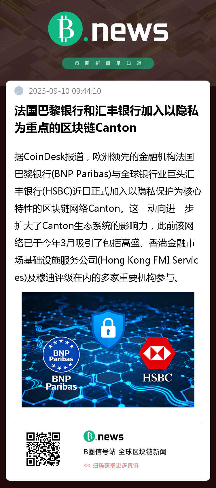 据CoinDesk报道,欧洲领先的金融机构法国巴黎银行(BNP Paribas)与全球银行业巨头汇丰银行(HSBC)近日正式加入以隐私保护为核心特性的区块链网络Canton。这一动向进一步扩大了Canton生态系统的影响力,此前该网络已于今年3月吸引了包括高盛、香港金融市场基础设施服务公司(Hong Kong FMI Services)及穆迪评级在内的多家重要机构参与。