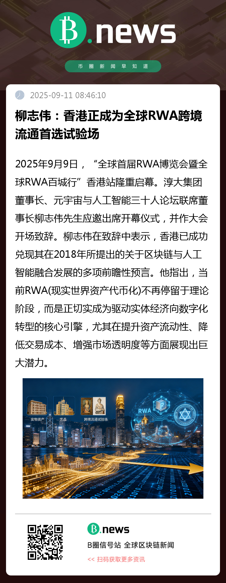他指出,当前RWA(现实世界资产代币化)不再停留于理论阶段,而是正切实成为驱动实体经济向数字化转型的核心引擎,尤其在提升资产流动性、降低交易成本、增强市场透明度等方面展现出巨大潜力。