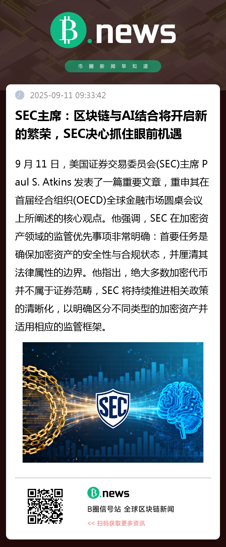 9 月 11 日,美国证券交易委员会(SEC)主席 Paul S. Atkins 发表了一篇重要文章,重申其在首届经合组织(OECD)全球金融市场圆桌会议上所阐述的核心观点。他强调,SEC 在加密资产领域的监管优先事项非常明确:首要任务是确保加密资产的安全性与合规状态,并厘清其法律属性的边界。
