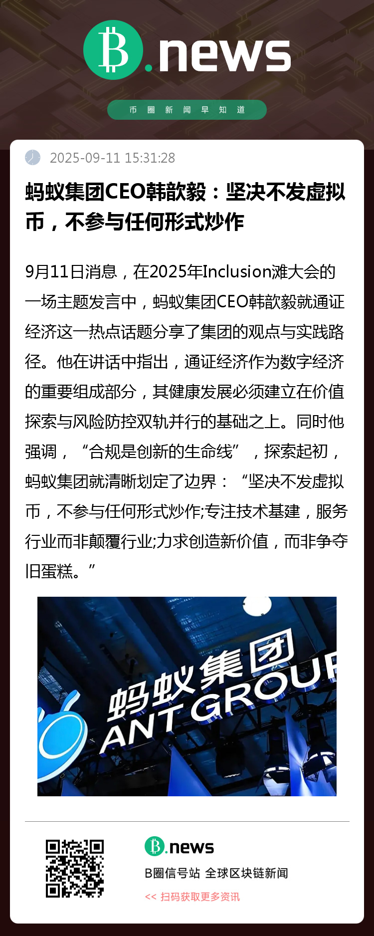 9月11日消息,在2025年Inclusion滩大会的一场主题发言中,蚂蚁集团CEO韩歆毅就通证经济这一热点话题分享了集团的观点与实践路径。他在讲话中指出,通证经济作为数字经济的重要组成部分,其健康发展必须建立在价值探索与风险防控双轨并行的基础之上。