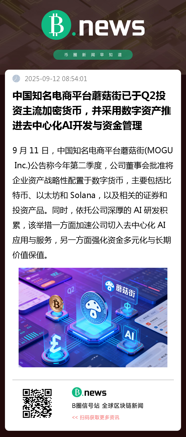 9 月 11 日,中国知名社交电商平台蘑菇街(MOGU Inc.,NYSE: MOGU)发布公告称,公司董事会已于今年第二季度正式批准一项战略性资产配置计划,将企业资金部分投入数字货币领域,主要包括比特币(Bitcoin)、以太坊(Ethereum)和 Solana(SOL),以及相关证券与投资产品。该决策不仅基于对公司现有 AI 技术积累的充分信心,也标志着蘑菇街正式进军去中心化人工智能与区块链融合创新的新赛道。