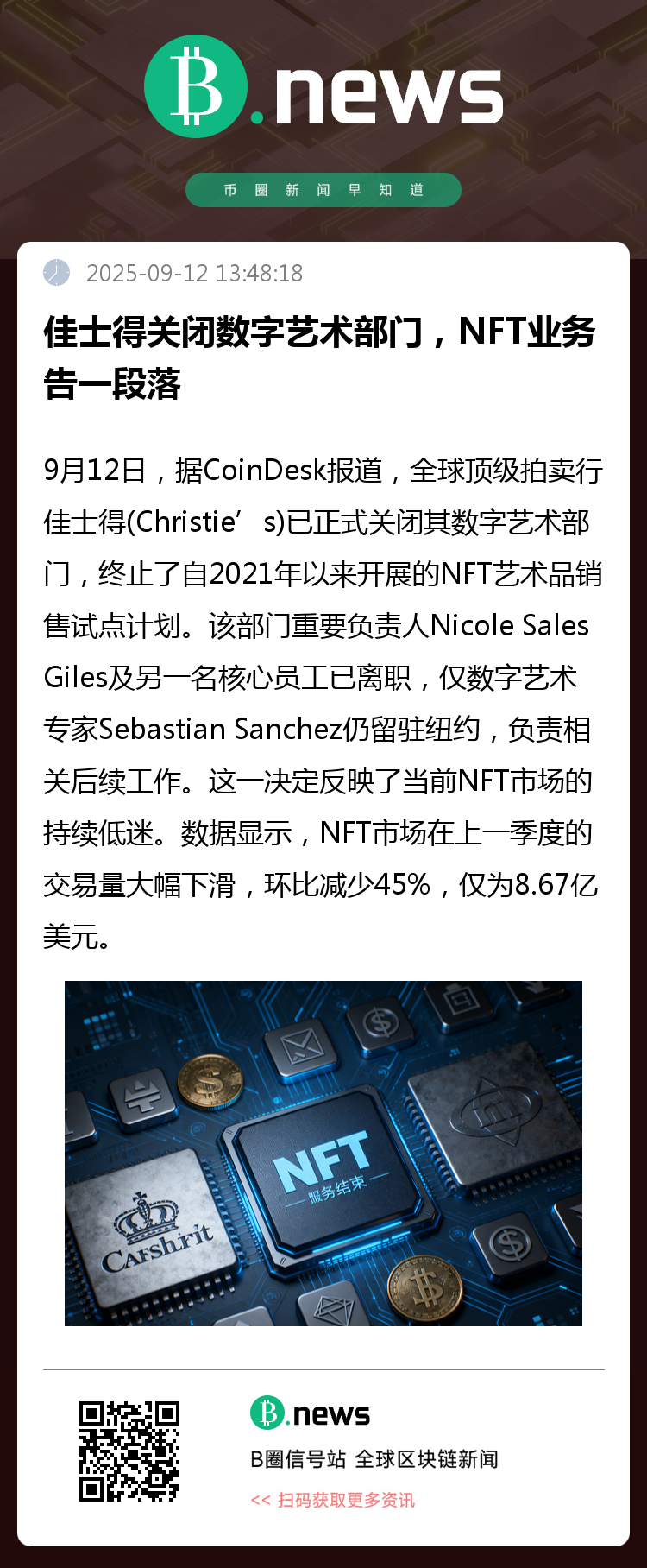 9月12日,据CoinDesk报道,全球顶级拍卖行佳士得(Christie’s)已正式关闭其数字艺术部门,终止了自2021年以来开展的NFT艺术品销售试点计划。该部门重要负责人Nicole Sales Giles及另一名核心员工已离职,仅数字艺术专家Sebastian Sanchez仍留驻纽约,负责相关后续工作。