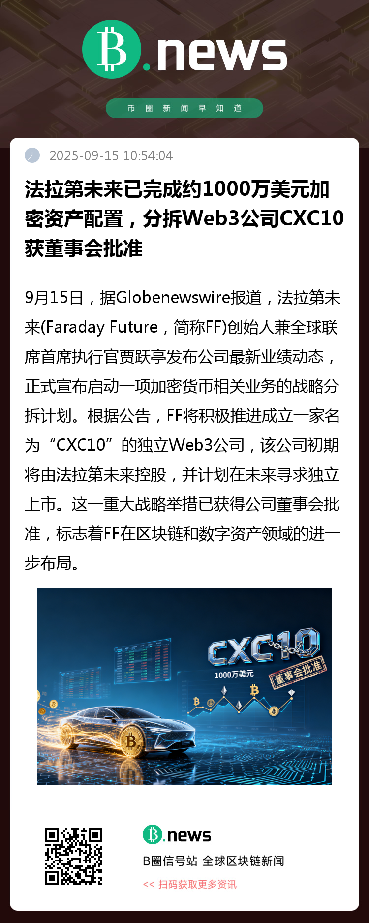 9月15日,据Globenewswire报道,法拉第未来(Faraday Future,简称FF)创始人兼全球联席首席执行官贾跃亭发布公司最新业绩动态,正式宣布启动一项加密货币相关业务的战略分拆计划。根据公告,FF将积极推进成立一家名为“CXC10”的独立Web3公司,该公司初期将由法拉第未来控股,并计划在未来寻求独立上市。这一重大战略举措已获得公司董事会批准,标志着FF在区块链和数字资产领域的进一步布局。