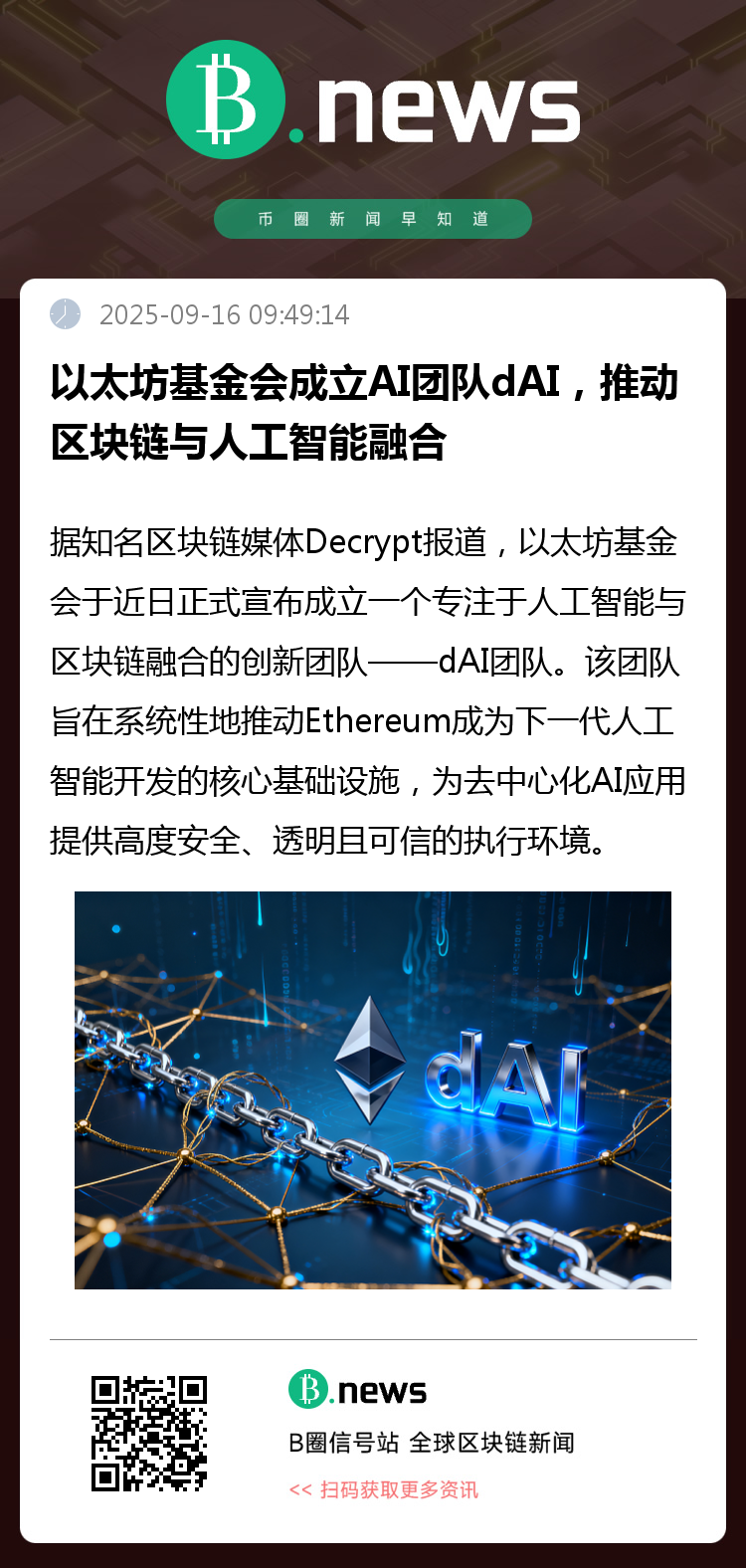 据知名区块链媒体Decrypt报道,以太坊基金会于近日正式宣布成立一个专注于人工智能与区块链融合的创新团队——dAI团队。该团队旨在系统性地推动Ethereum成为下一代人工智能开发的核心基础设施,为去中心化AI应用提供高度安全、透明且可信的执行环境。