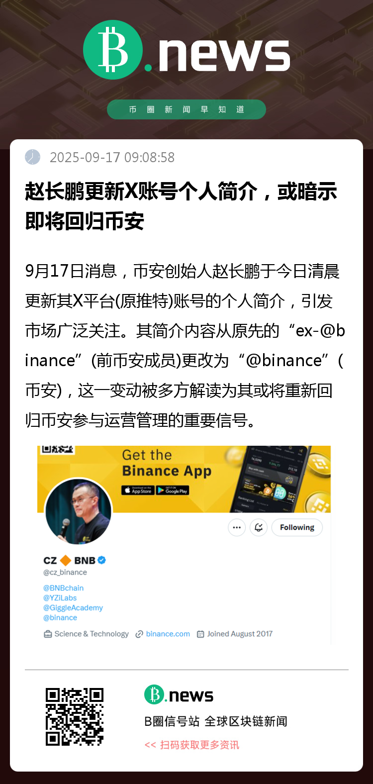 9月17日消息,币安创始人赵长鹏于今日清晨更新其X平台(原推特)账号的个人简介,引发市场广泛关注。其简介内容从原先的“ex-@binance”(前币安成员)更改为“@binance”(币安),这一变动被多方解读为其或将重新回归币安参与运营管理的重要信号。