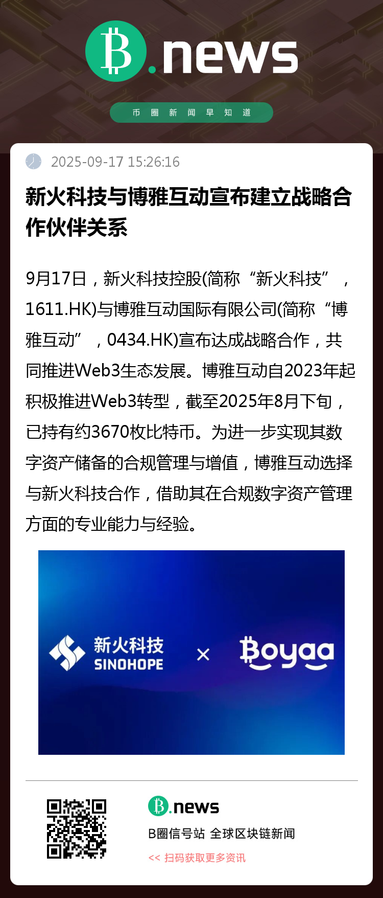 9月17日,新火科技控股(简称“新火科技”,1611.HK)与博雅互动国际有限公司(简称“博雅互动”,0434.HK)宣布达成战略合作,共同推进Web3生态发展。