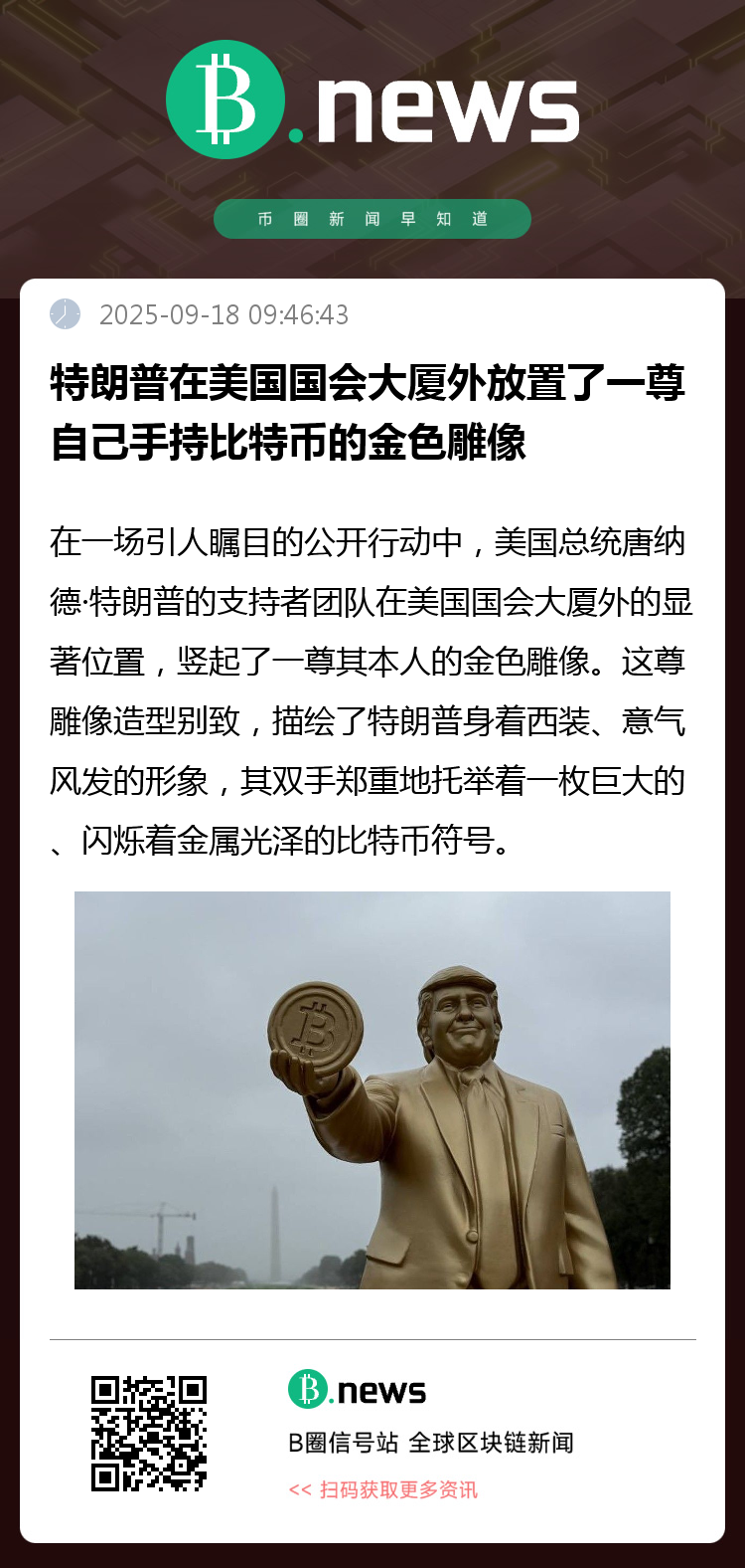 在一场引人瞩目的公开行动中,美国总统唐纳德·特朗普的支持者团队在美国国会大厦外的显著位置,竖起了一尊其本人的金色雕像。这尊雕像造型别致,描绘了特朗普身着西装、意气风发的形象,其双手郑重地托举着一枚巨大的、闪烁着金属光泽的比特币符号。