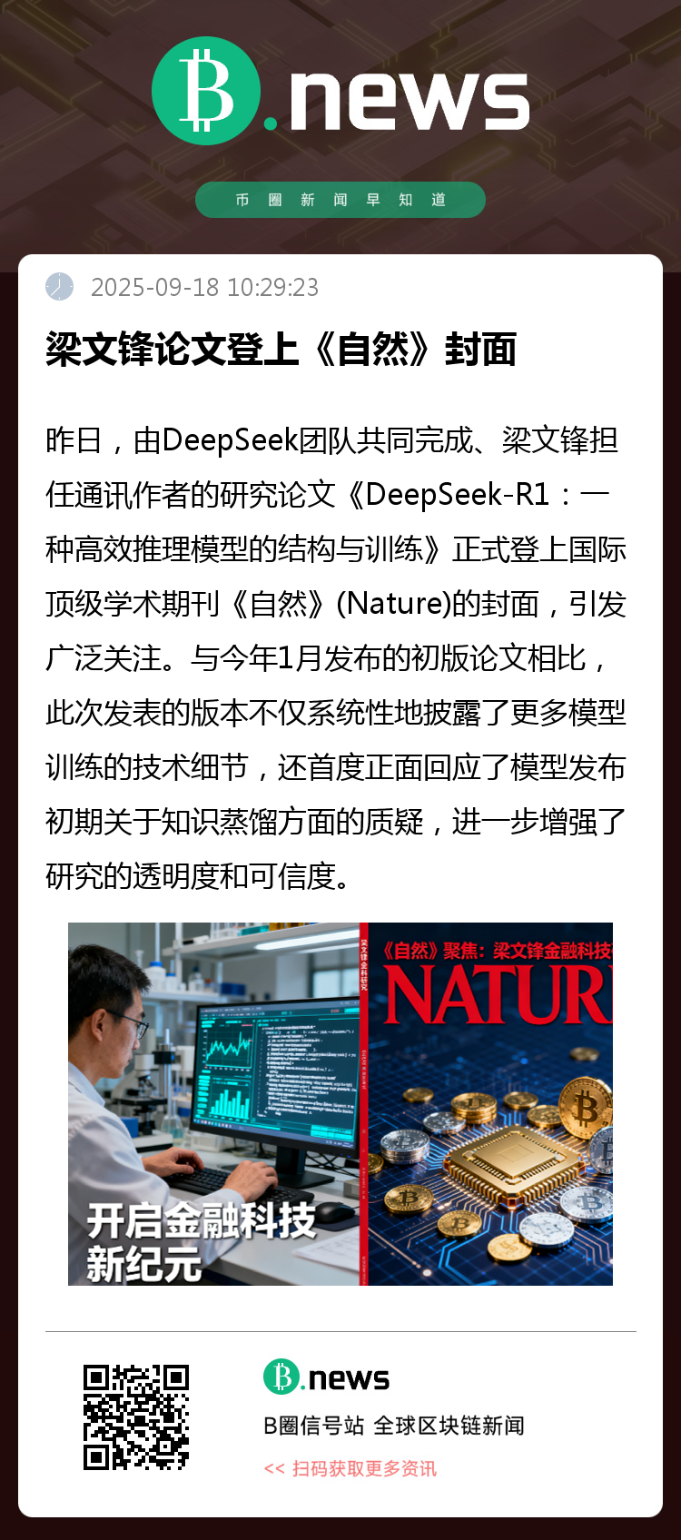 9月17日,由DeepSeek团队共同完成、梁文锋担任通讯作者的研究论文《DeepSeek-R1:一种高效推理模型的结构与训练》正式登上国际顶级学术期刊《自然》(Nature)的封面,引发广泛关注。