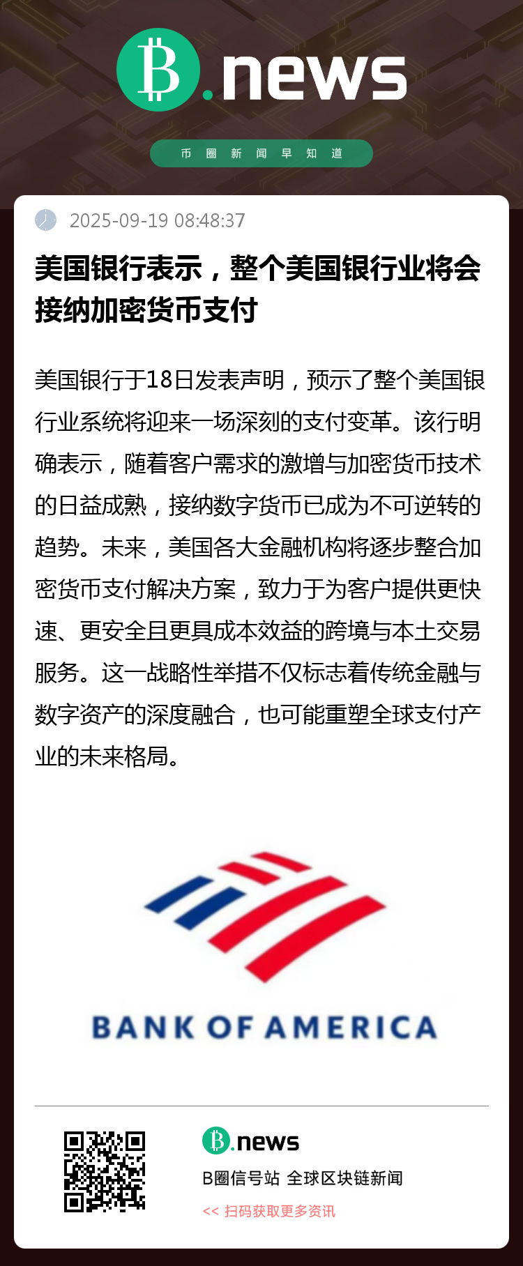 全球金融服务业巨头美国银行(Bank of America)于17日表示,接纳加密货币支付已不再是个别机构的尝试性探索,而是即将成为整个美国银行业的一项普遍性、战略性举措。这标志着传统金融体系与数字资产世界之间的壁垒正在被彻底打破,一场深远的支付革命已然拉开序幕。