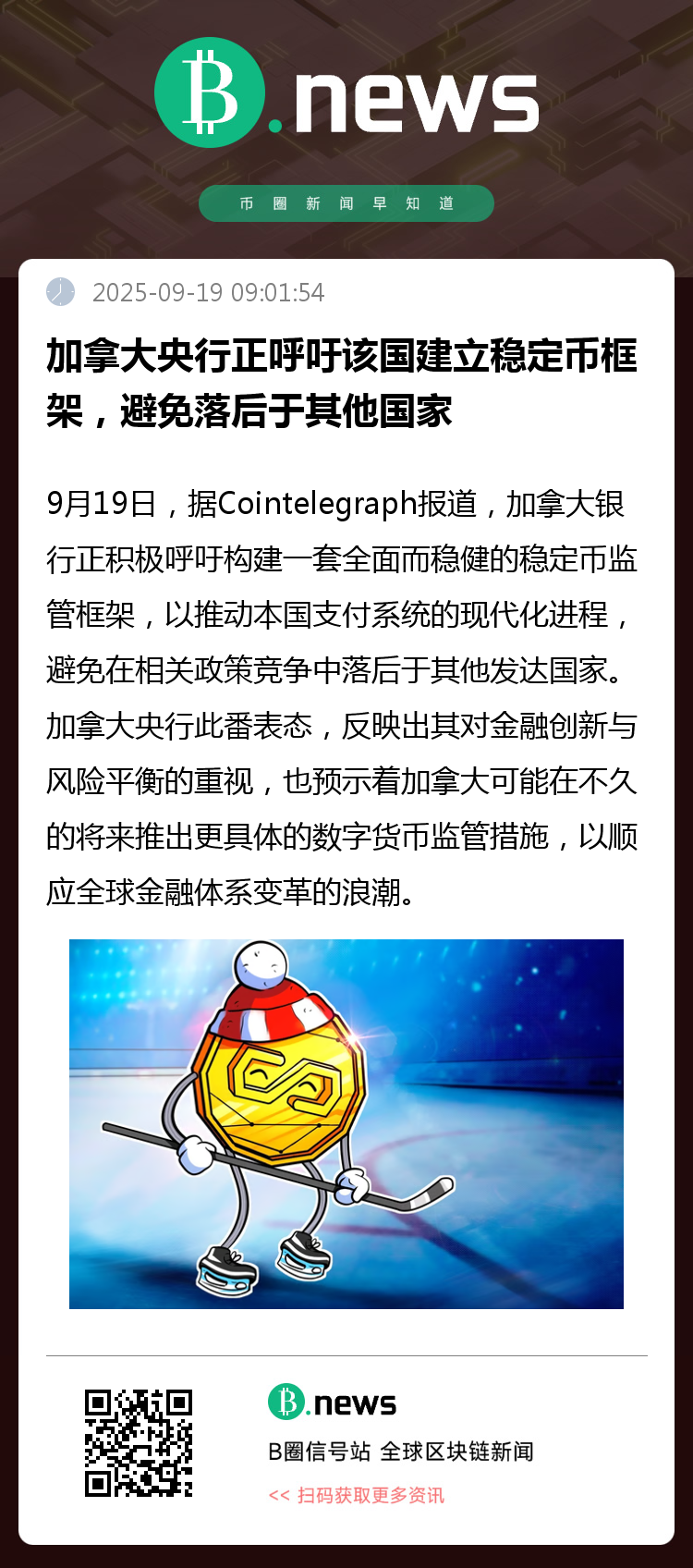 9月19日,据Cointelegraph报道,加拿大银行正积极呼吁构建一套全面而稳健的稳定币监管框架,以推动本国支付系统的现代化进程,并避免在相关政策竞争中落后于其他发达国家。
