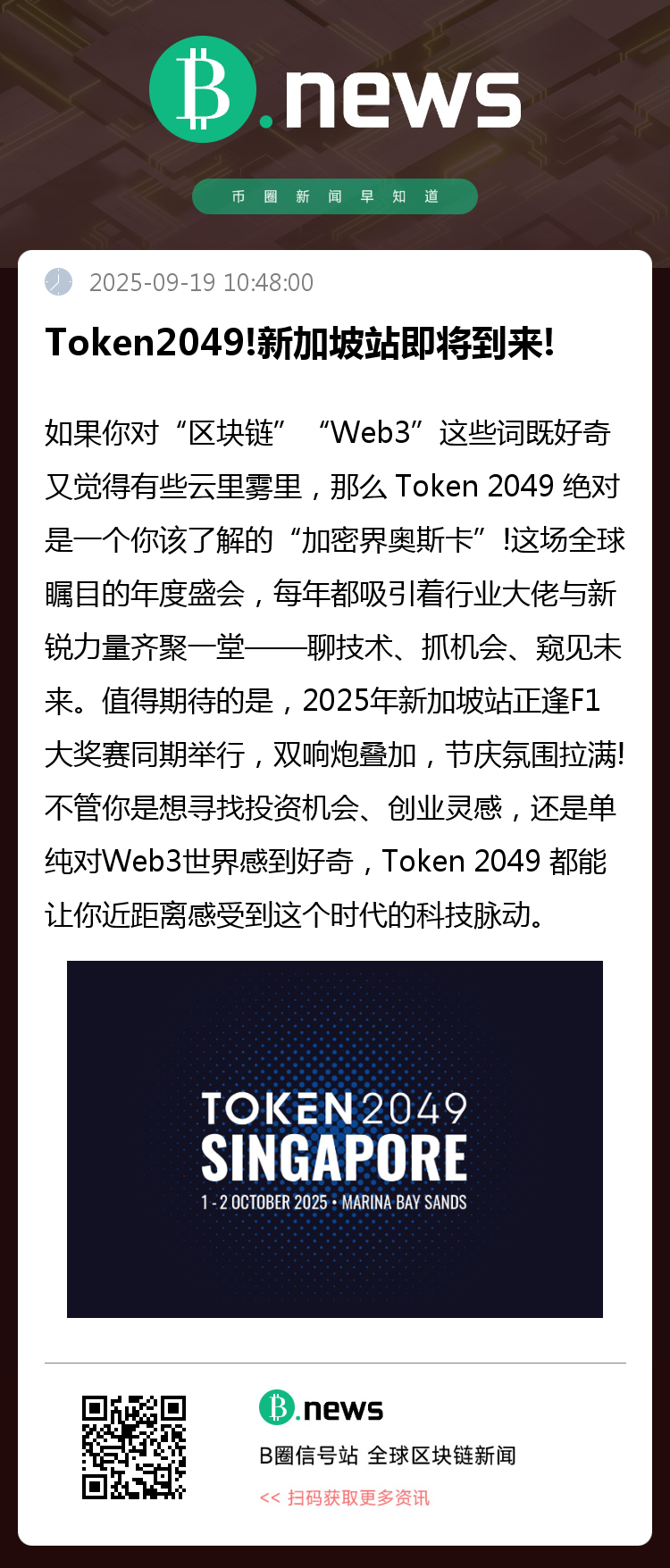 Token 2049十月份将在新加坡重磅举行:2025年10月1-2日,地点是标志性的滨海湾金沙酒店。这一场预计吸引超过2.5万人,绝对是人气爆棚!