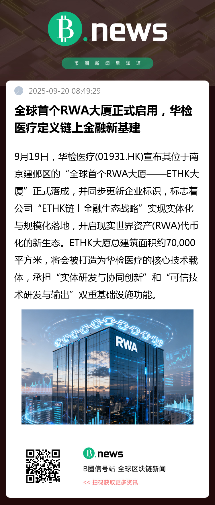 9月19日,华检医疗(01931.HK)宣布其位于南京建邺区的“全球首个RWA大厦——ETHK大厦”正式落成,并同步更新企业标识,标志着公司“ETHK链上金融生态战略”实现实体化与规模化落地,开启现实世界资产(RWA)代币化的新生态。
