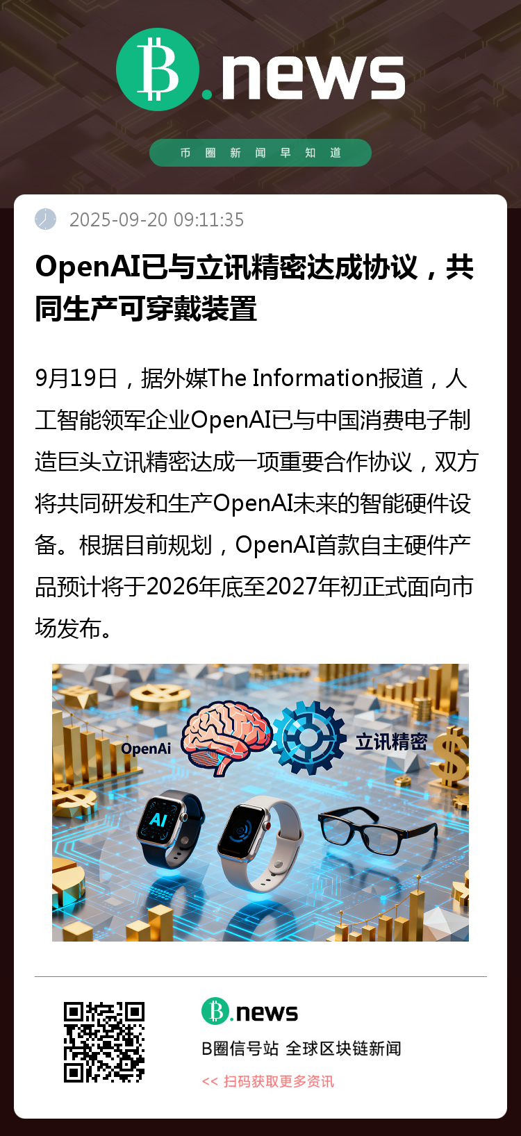 9月19日,据外媒The Information报道,人工智能领军企业OpenAI已与中国消费电子制造巨头立讯精密达成一项重要合作协议,双方将共同研发和生产OpenAI未来的智能硬件设备。根据目前规划,OpenAI首款自主硬件产品预计将于2026年底至2027年初正式面向市场发布。