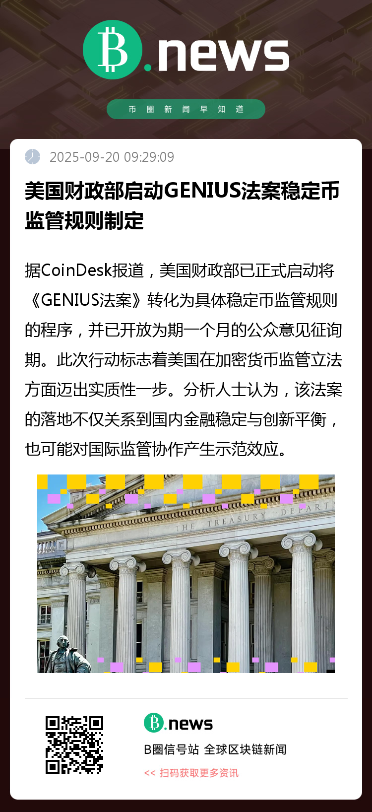 据CoinDesk报道,美国财政部已正式启动将《GENIUS法案》转化为具体稳定币监管规则的程序,并开放为期一个月的公众意见征询期。此次行动标志着美国在加密货币监管立法方面迈出实质性一步,财政部通过发布一份“预先通知拟议规则制定”(ANPRM),广泛征求行业及公众对多项关键议题的看法。