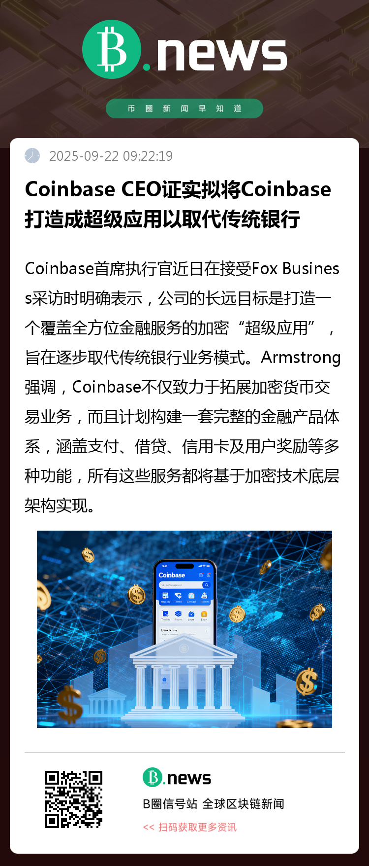 Coinbase首席执行官近日在接受Fox Business采访时明确表示,该公司的长远目标是打造一个覆盖全方位金融服务的加密“超级应用”,旨在逐步取代传统银行业务模式。Armstrong强调,Coinbase不仅致力于拓展加密货币交易业务,更计划构建一套完整的金融产品体系,涵盖支付、借贷、信用卡及用户奖励等多种功能,所有这些服务都将基于加密技术底层架构实现。