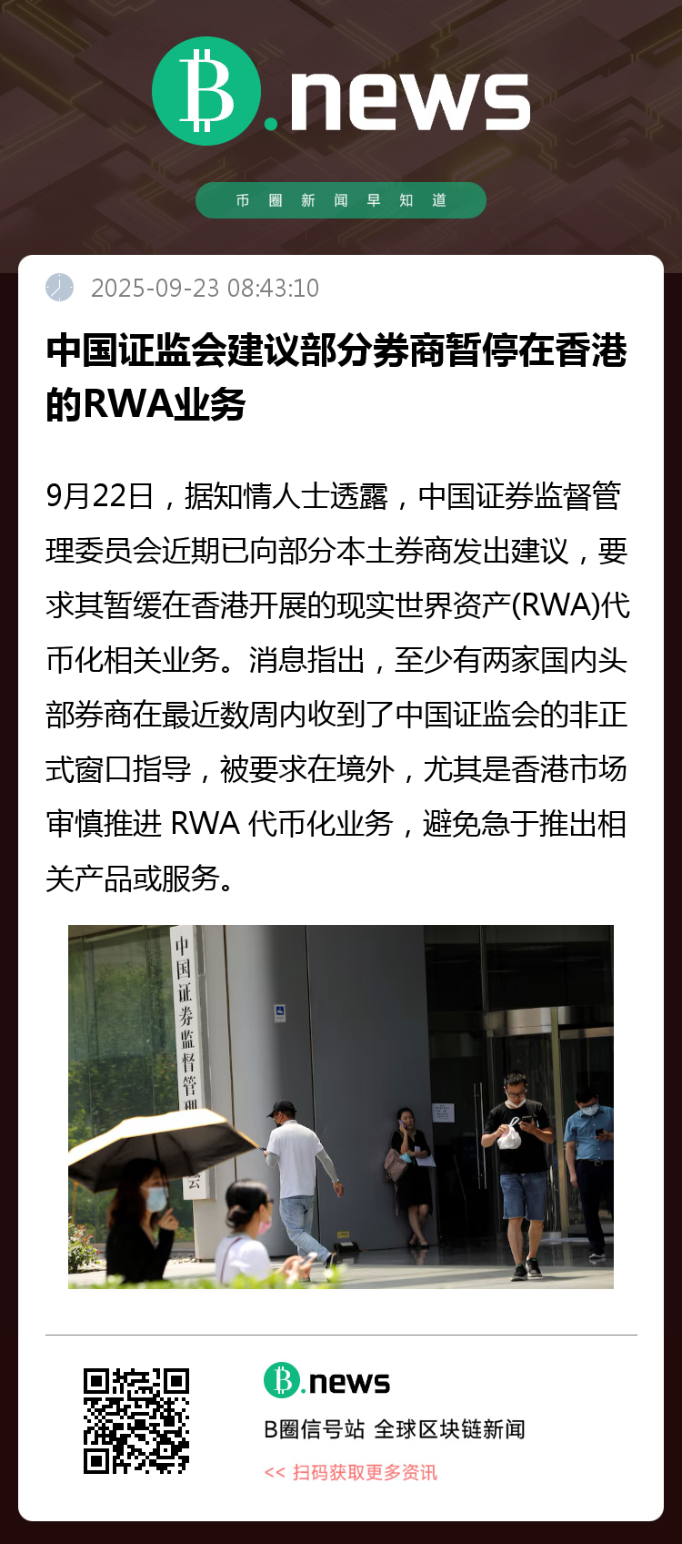 9月22日,据知情人士透露,中国证券监督管理委员会近期已向部分本土券商发出建议,要求其暂缓在香港开展的现实世界资产(RWA)代币化相关业务。