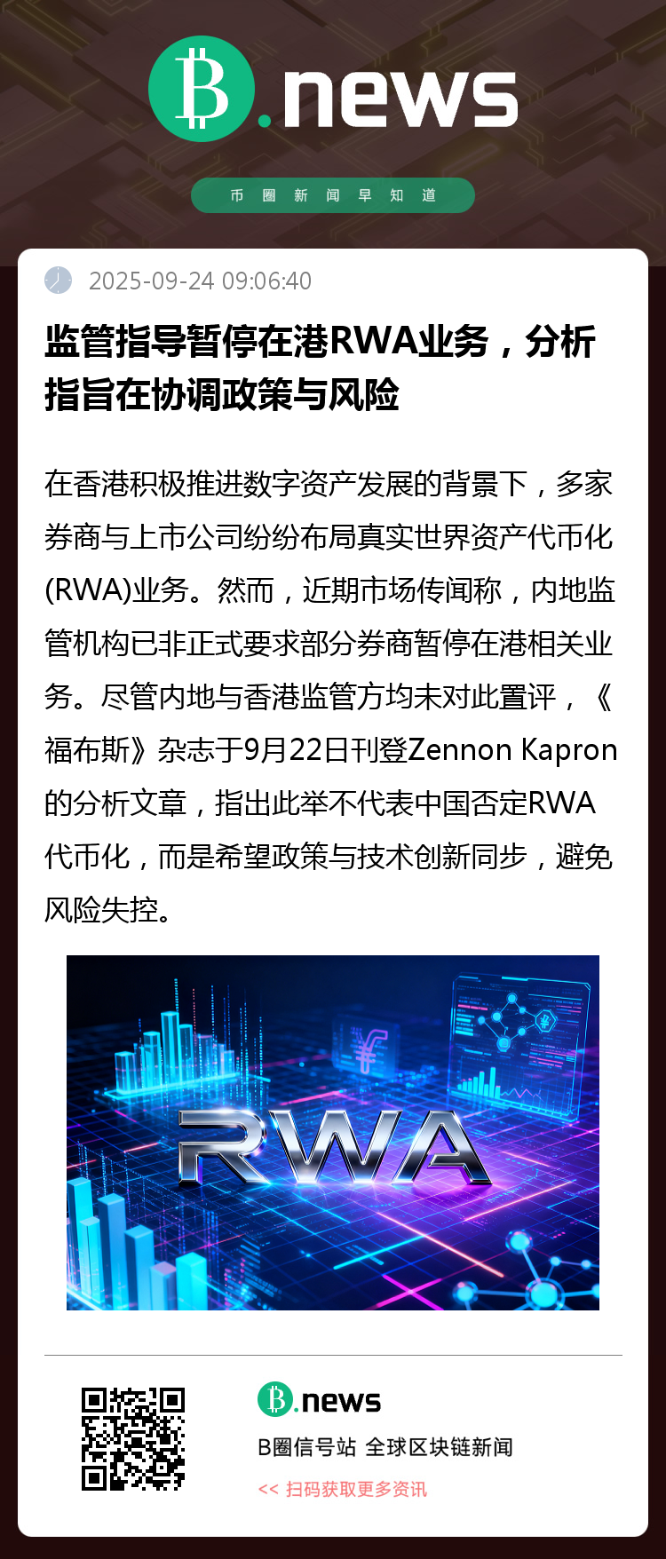 在香港积极推进数字资产发展的背景下,多家券商与上市公司纷纷布局真实世界资产代币化(RWA)业务。然而,近期市场传闻称,内地监管机构已非正式要求部分券商暂停在港相关业务。尽管内地与香港监管方均未对此置评,《福布斯》杂志于9月22日刊登Zennon Kapron的分析文章,指出此举不代表中国否定RWA代币化,而是希望政策与技术创新同步,避免风险失控。