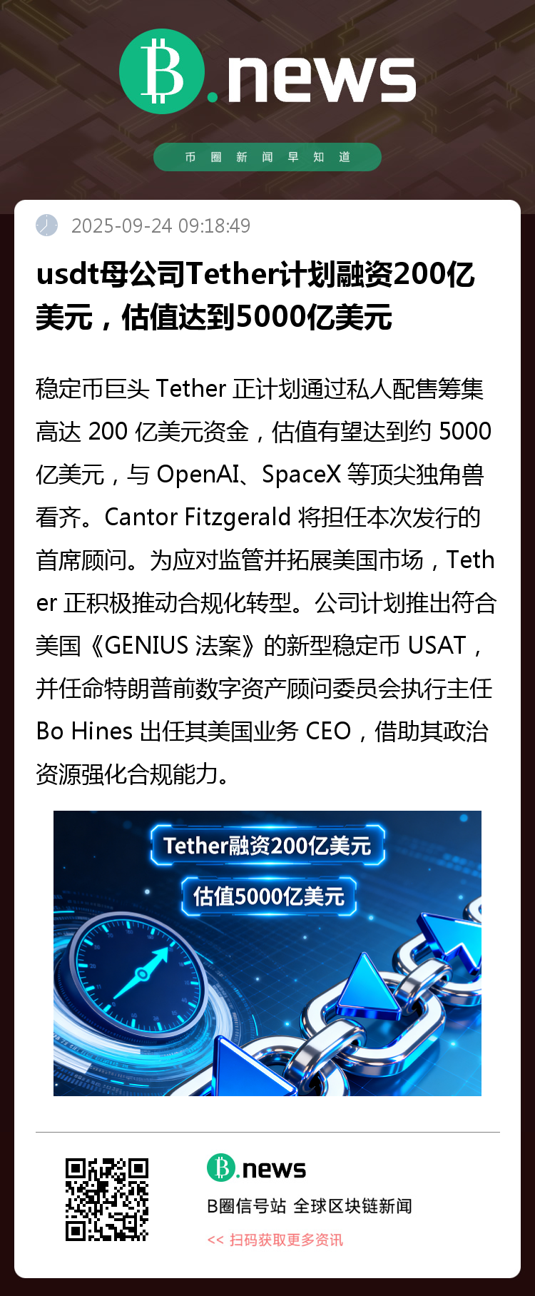 据彭博社报道,稳定币巨头 Tether 正计划通过私人配售筹集高达 200 亿美元资金,估值有望达到约 5000 亿美元,与 OpenAI、SpaceX 等顶尖独角兽看齐。Cantor Fitzgerald 将担任本次发行的首席顾问。