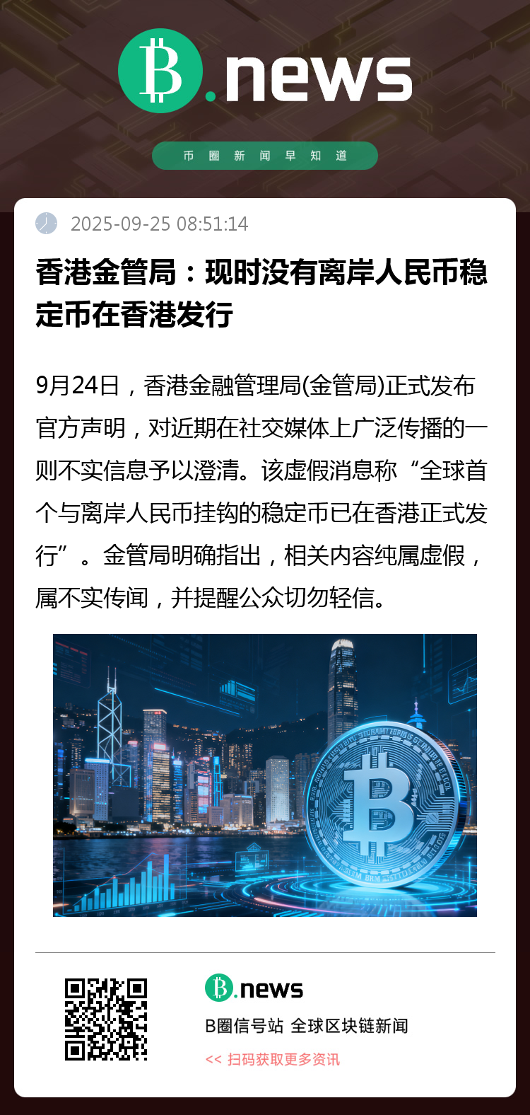 9月24日,香港金融管理局(金管局)发布官方声明,对近期在社交媒体上广泛传播的一则不实信息予以澄清。该虚假消息声称“全球首个与离岸人民币挂钩的稳定币已在香港正式发行”。金管局明确指出,相关内容纯属虚假,属不实传闻,并提醒公众切勿轻信。