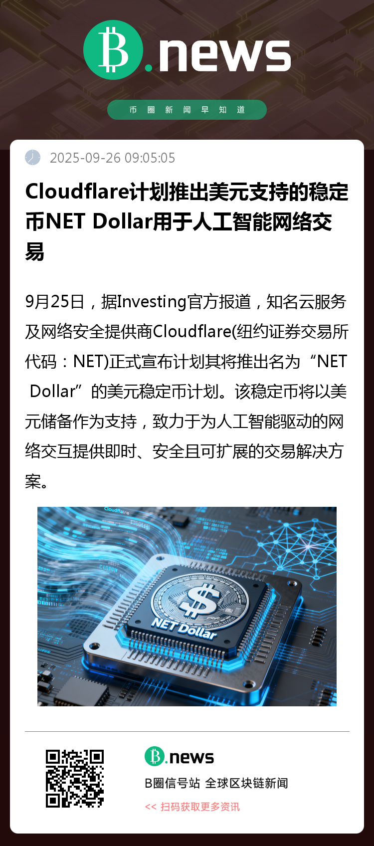 9月25日,据Investing报道,知名云服务及网络安全提供商Cloudflare(纽约证券交易所代码:NET)正式披露其将推出名为“NET Dollar”的美元稳定币计划。该稳定币将以美元储备为支持,致力于为人工智能驱动的网络交互提供即时、安全且可扩展的交易解决方案。
