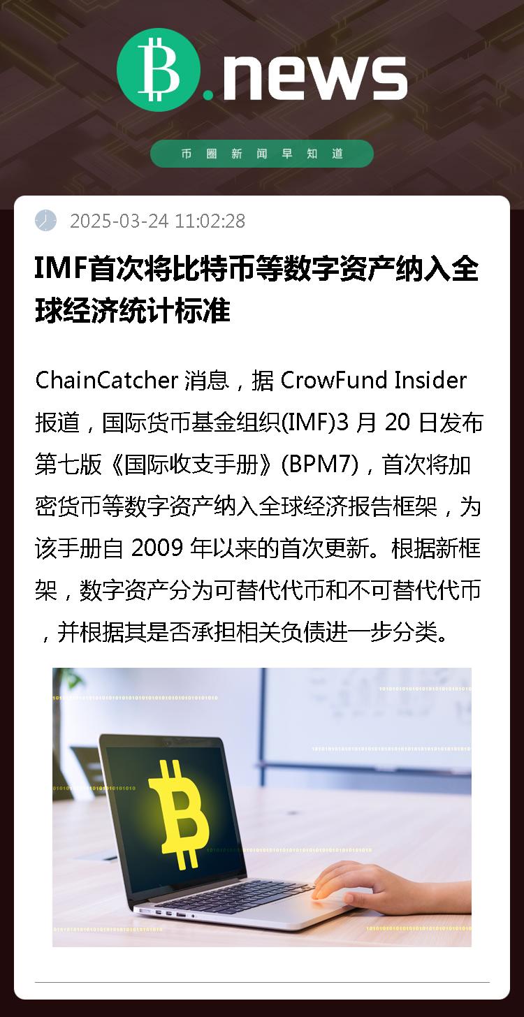 ChainCatcher 消息,据 CrowFund Insider 报道,国际货币基金组织(IMF)3 月 20 日发布第七版《国际收支手册》(BPM7),首次将加密货币等数字资产纳入全球经济报告框架,为该手册自 2009 年以来的首次更新。根据新框架,数字资产分为可替代代币和不可替代代币,并根据其是否承担相关负债进一步分类: