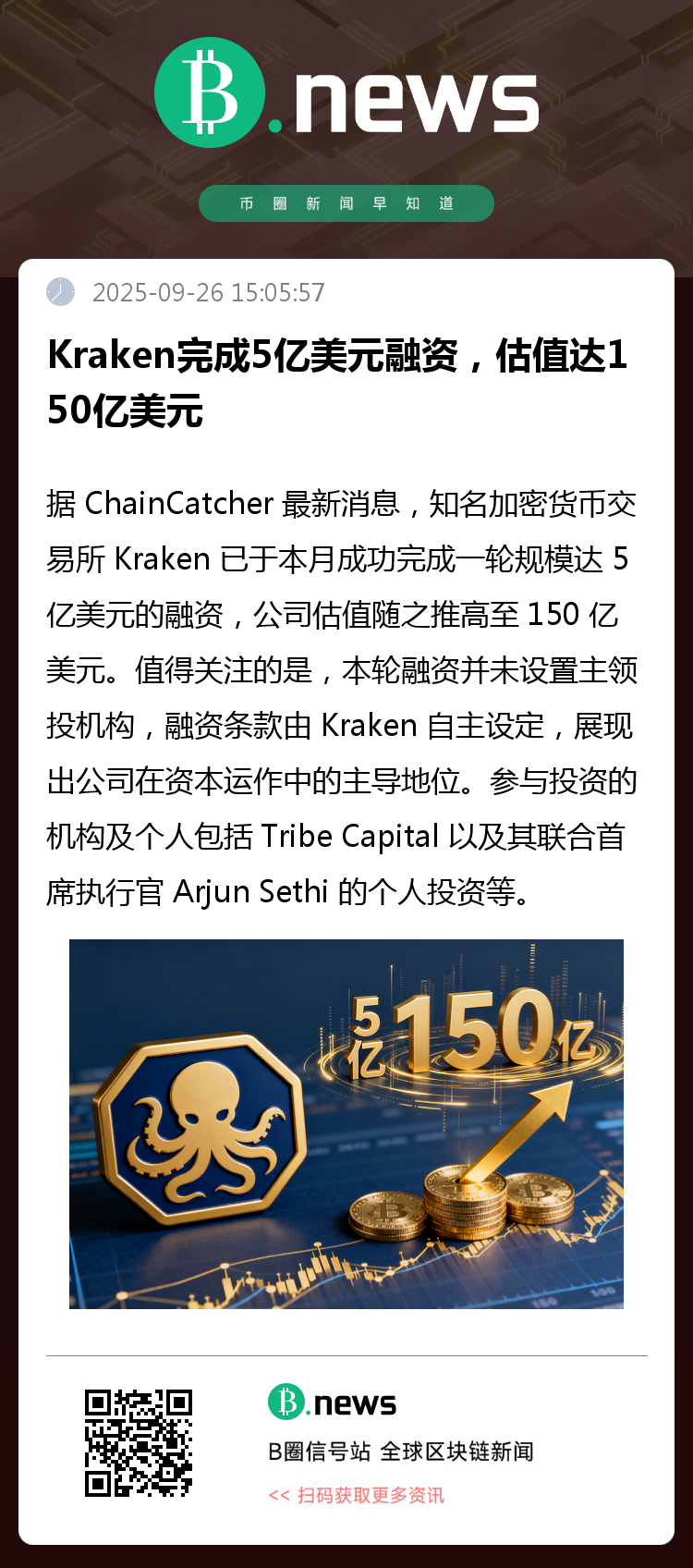 据 ChainCatcher 最新消息,知名加密货币交易所 Kraken 已于本月成功完成一轮规模达 5 亿美元的融资,公司估值随之推高至 150 亿美元。值得关注的是,本轮融资并未设置主领投机构,融资条款由 Kraken 自主设定,展现出公司在资本运作中的主导地位。