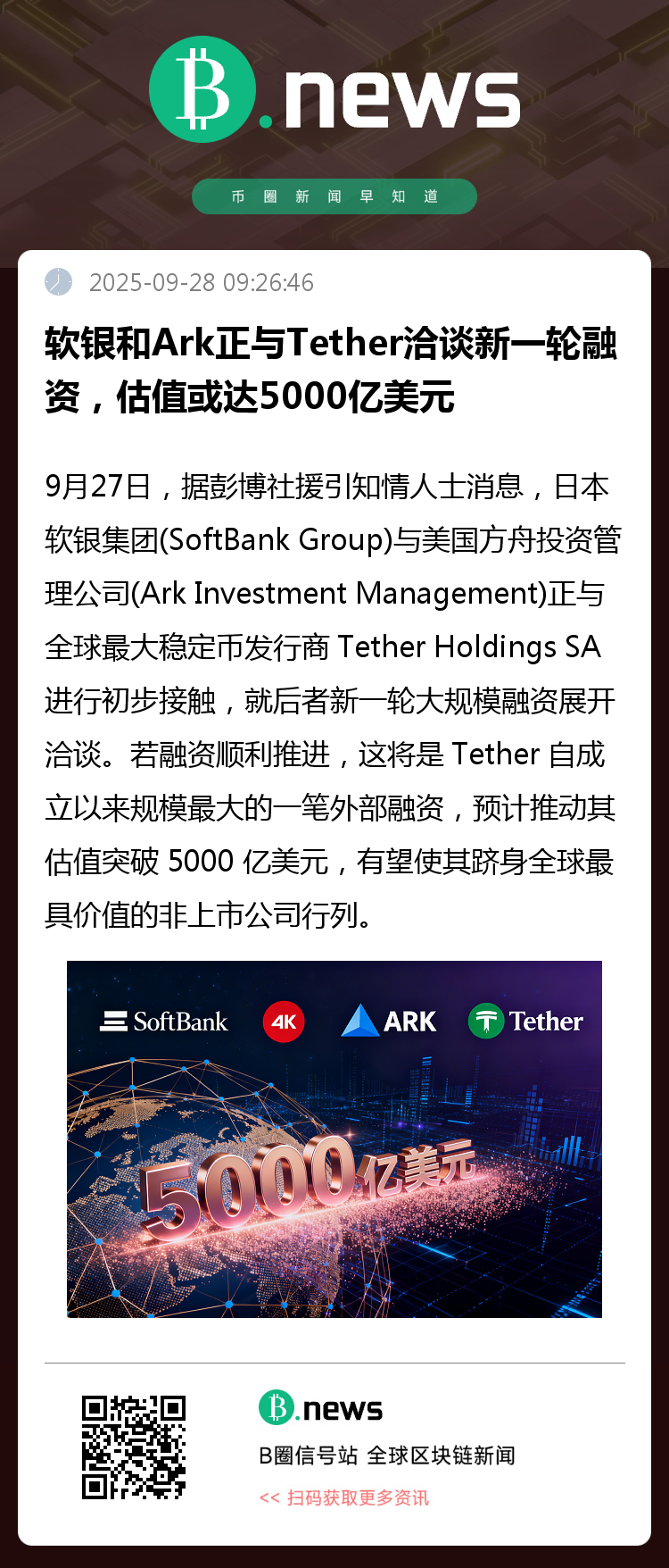 9月27日,据彭博社援引知情人士消息,日本软银集团(SoftBank Group)与美国方舟投资管理公司(Ark Investment Management)正与全球最大稳定币发行商 Tether Holdings SA 进行初步接触,就后者新一轮大规模融资展开洽谈。若融资顺利推进,这将是 Tether 自成立以来规模最大的一笔外部融资,预计推动其估值突破 5000 亿美元,有望使其跻身全球最具价值的非上市公司行列。